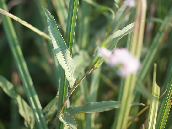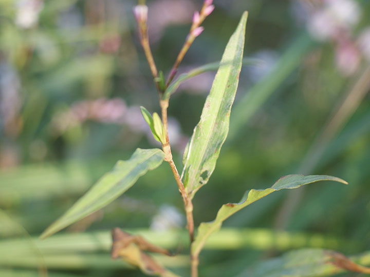 水辺や湿地に生育する多年草。高さ 50 - 100 cm。地下茎を横にのばしてふえる。茎は直立し,よく分枝して無毛。葉は互生し,披針形,長さ 7 - 13 cm,鋭尖頭,基部はくさび形,質厚く,両面に短毛があり,裏面には腺点がある。葉には短い柄がある。托葉鞘は長さ約1.5 cm筒形で,縁に長い剛毛がある。雌雄異株。細長い総状花序にややまばらに花をつけ,上部は垂れる。萼は5裂し,裂片は淡紅色,長さ 5 - 6 mmの広楕円形,先は円形,腺点がある。雄花は雄しべが雌しべより長く,雌花では雌しべは雄しべより長い。そう果は3稜形,長さ約 3.5 mm,赤褐色から黒色。 花期:8 - 10月 分布:本州・四国・九州,琉球;朝鮮半島 Persicaria イヌタデ属: イヌタデ サクラタデ シロバナサクラタデ ツルソバ ナガバノウナギツカミ ママコノシリヌグイ ミゾソバ ミヤマタニソバ |