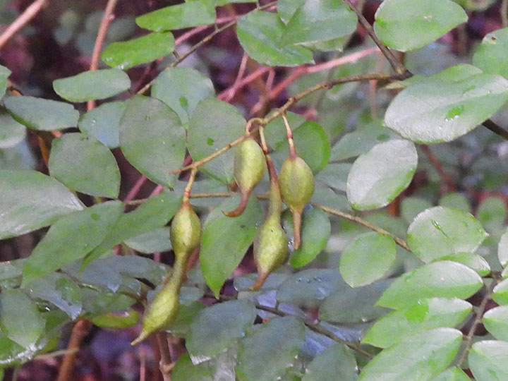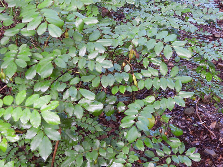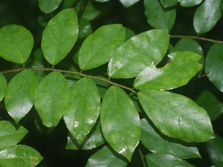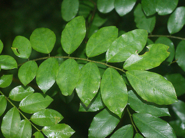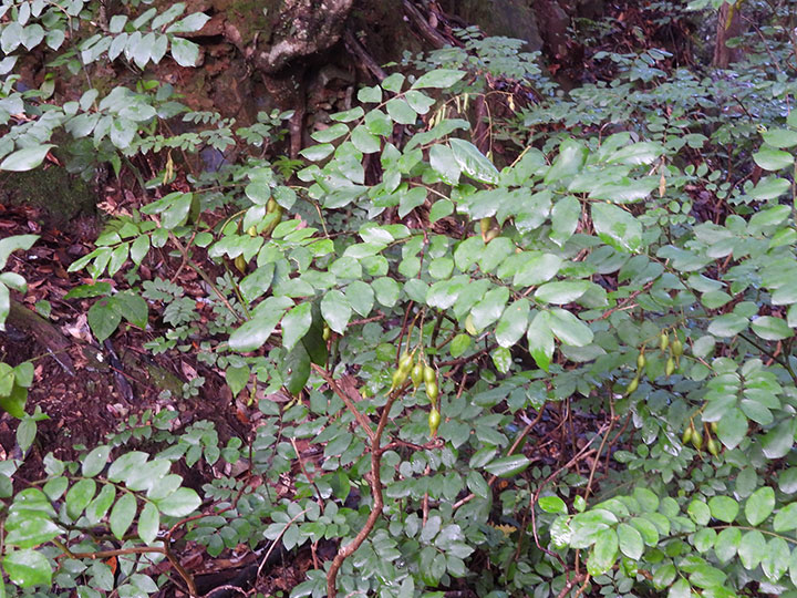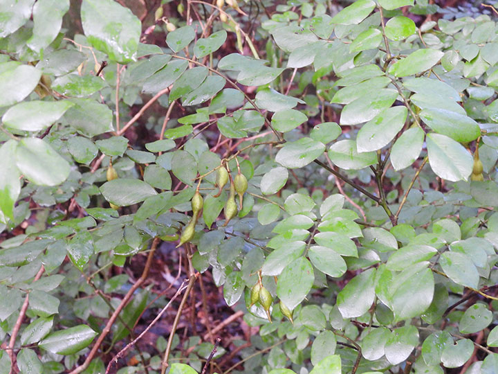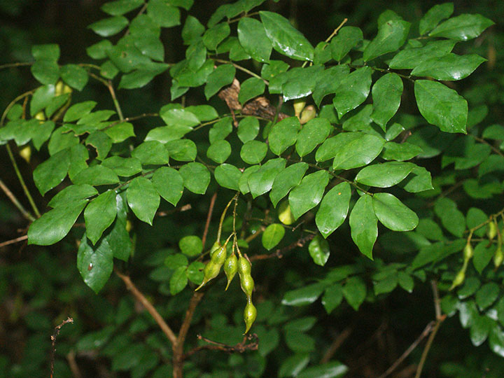 渓谷沿いの湿った林内に生育する常緑低木。高さ1 - 3 m。若枝は緑色で草状,褐色の圧軟毛が密生するが,のち無毛。葉は奇数羽状複葉で11 - 15個の小葉からなり,長さ10 - 15 cm,側小葉は互生またはほぼ対生する。葉柄は長さ1 - 2 cm。小葉は楕円形で長さ 2.5 - 5 cm,幅1.5 - 2 cm,鋭頭,基部は円形又は狭くなり,表面はやや無毛,裏面と縁に伏した褐色の短毛を密生する。総状花序に白色の花をつける。豆果は円柱形,長さ4 - 6 cm,幅約 1.2 cm,褐色,有毛,細い嘴があり,種子が複数なら種子の間がくびれる。種子は1個まれに,2 - 3個,黄色,卵形,長さ約 8 mm,光沢がある。 花期: 5月 果期:9 - 10月 分布:九州南部(熊本・宮崎・鹿児島県);中国(南部) Sophora クララ属: クララ ツクシムレスズメ |
