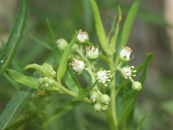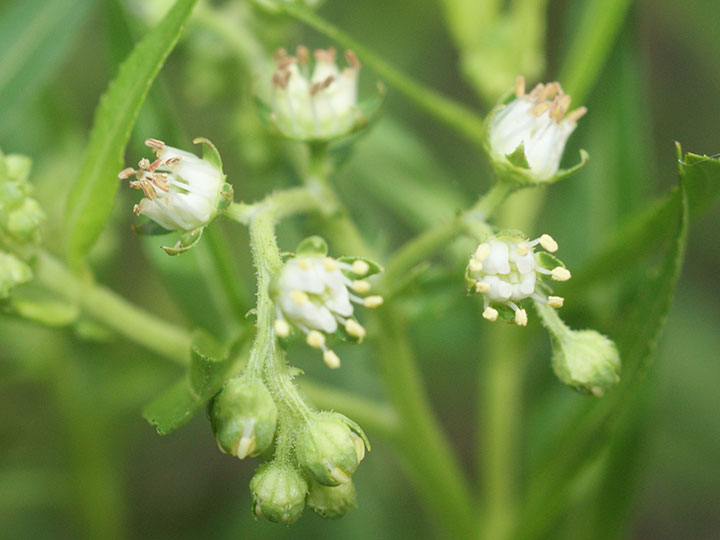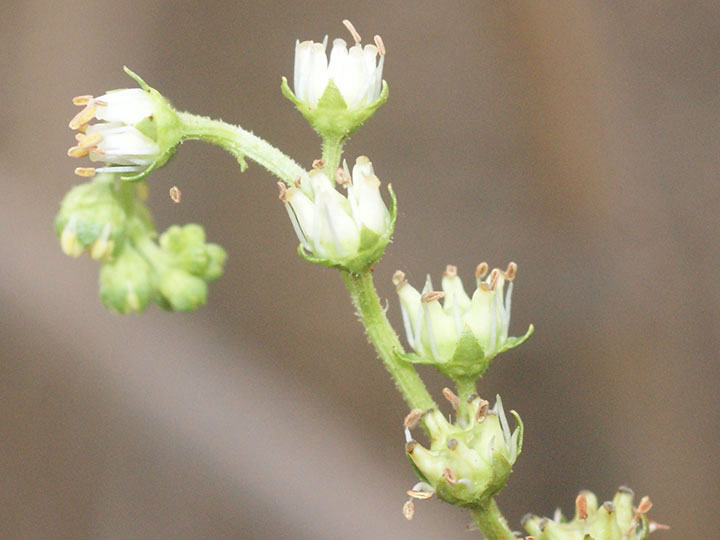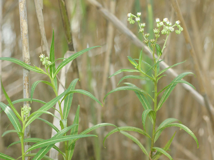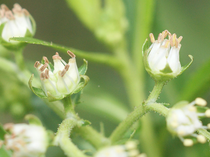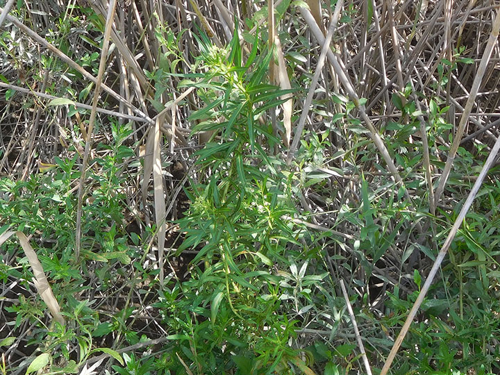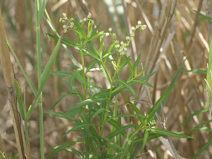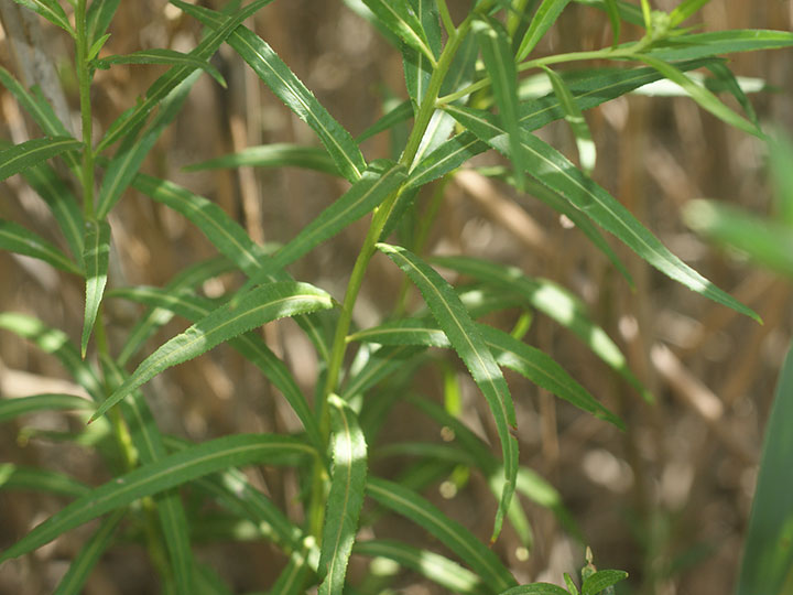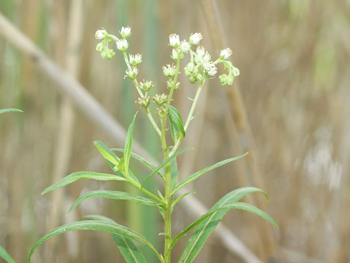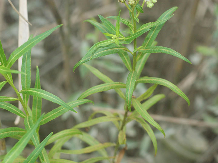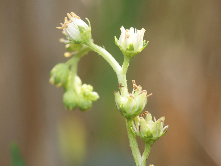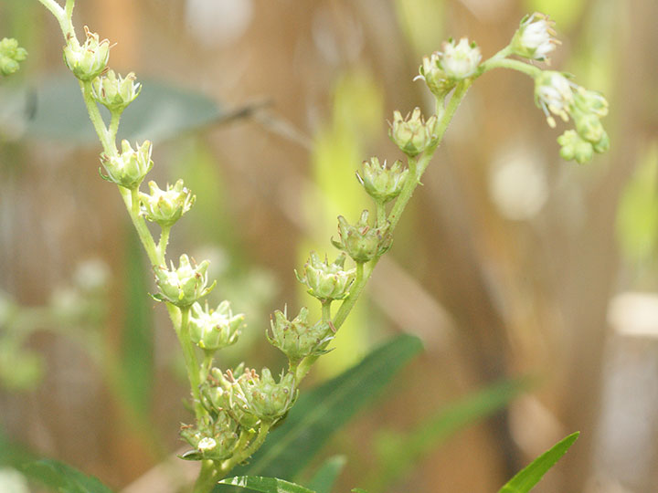 沼,水田,川原など水位の変動する湿地に生育する多年草。茎の基部は地中にあって肥厚し,数本の走出枝を出す。茎の地上部は直立し,分枝せず,高さ 30 - 80 cm,無毛,淡紅色を帯びることが多い。葉は互生し,披針形 - 狭披針形,長さ4 - 10 cm,幅4 - 12 mm,無毛,細鋸歯縁,両端は長い尖鋭形,ほぼ無柄花序の枝は,はじめ,先端がうず巻き状に外向きに巻いているが,後に伸長して斜上し,長さ4 - 12 cmになり,ごく短い褐色のあらい毛がまばらに生え,多数の小さな花を総状に片側だけつける。苞は小さく,卵形 - 狭卵形。花柄は長さ 2 - 4 mm,褐色の腺毛がある。花は帯黄色,直径約 5 mm,花筒は長さ1 - 2 mm。萼は5裂し,萼片は卵状披針形 - 卵状三角形,長さ1.5 - 2 mm,花時に直立または斜開し,果期には平開 - 反転する。花弁はふつうない。雄ずいは10個,長さ 3 - 4 mm,裂開直前の葯は黄色。雌ずいは長さ約 3.1 mm。心皮は5(又は6)個,基部近くで合着する。子房は5個で基部合生し,花柱は5個,長さ 1 - 1.5 mm,花期に直立し,果期には外曲する。さく果は赤紫色,直径 6 - 7 mm,上部が横に裂け,帽子状にはずれる。種子は狭卵形,長さ約 0.7mm。 花期:8 - 9月 分布:本州,四国,九州,奄美大島;朝鮮半島,中国,モンゴル,ロシア,インドシナ半島 |