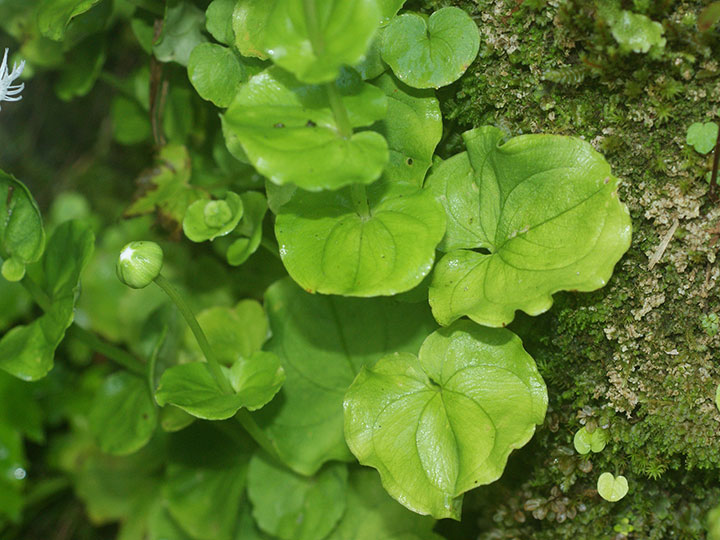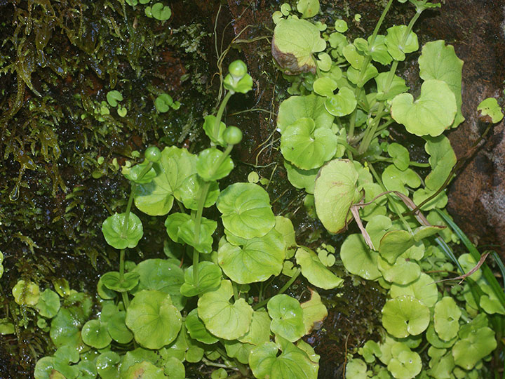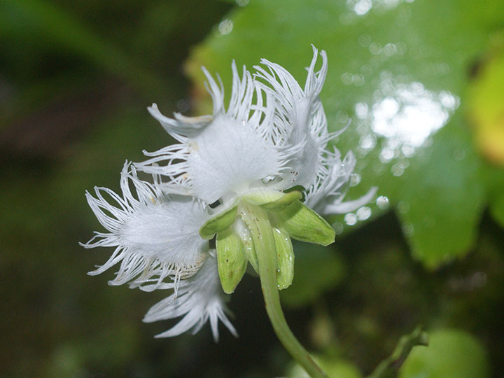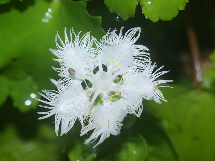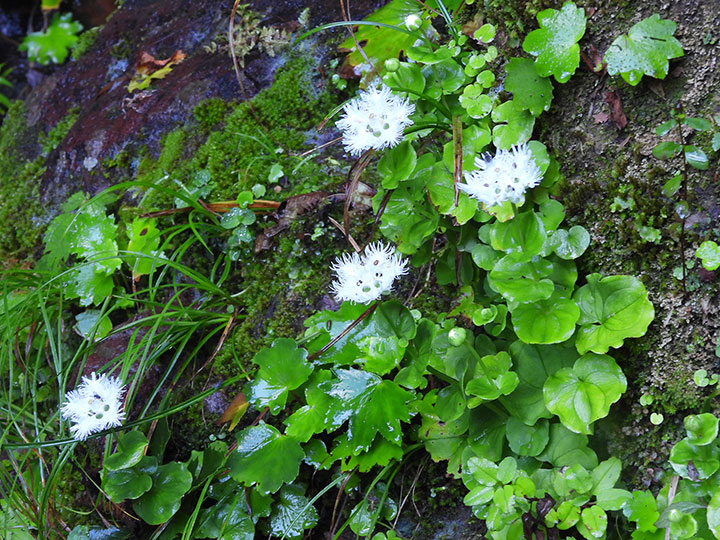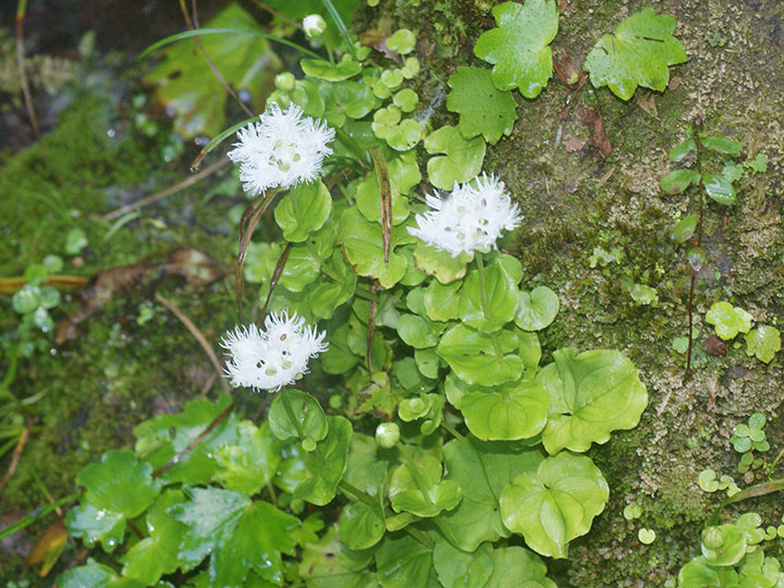 山地渓谷沿いや滝周辺の水がしたたる岩場に生育する多年草。全体に大型。茎は直立し高さ10-20 cm。根生葉は長い柄があり,腎形または広卵形で,基部は心形となり,長さ幅とも4 - 6 cm。茎葉は 2 - 4個。花茎の先端に1個の白い花をつける。花の直径は 3 - 3.5 cmで花期には斜開または平開する。5個の花弁は卵形で,長さ 1.6 - 1.8 cm,幅が広く,花弁同士が重なる。縁は糸状に細裂し,基部は細まって柄状。。雄ずいは5本。仮雄ずいは5本,長さ 4 mm,先は3裂して黄色の腺体がつく。 花期:8 - 9月 分布:本州(秋田県 - 兵庫県の日本海側) Parnassia ウメバチソウ属: ウメバチソウ オオシラヒゲソウ シラヒゲソウ |