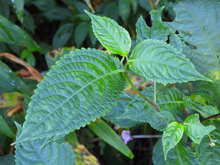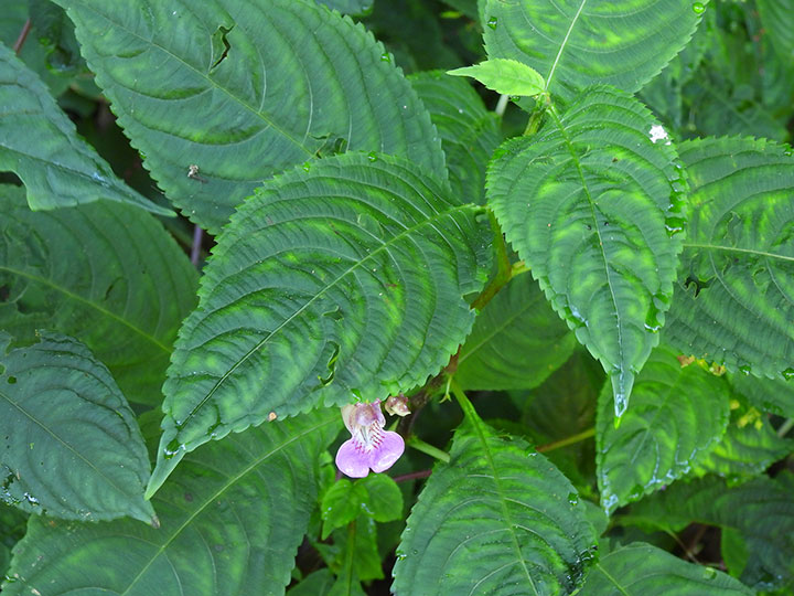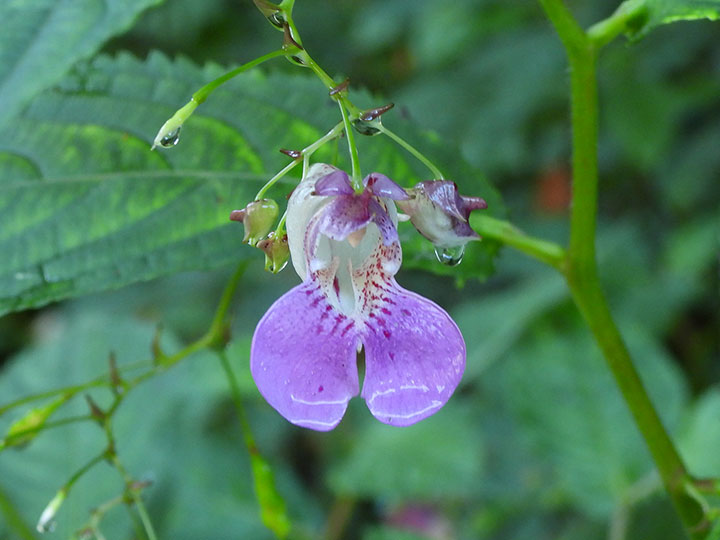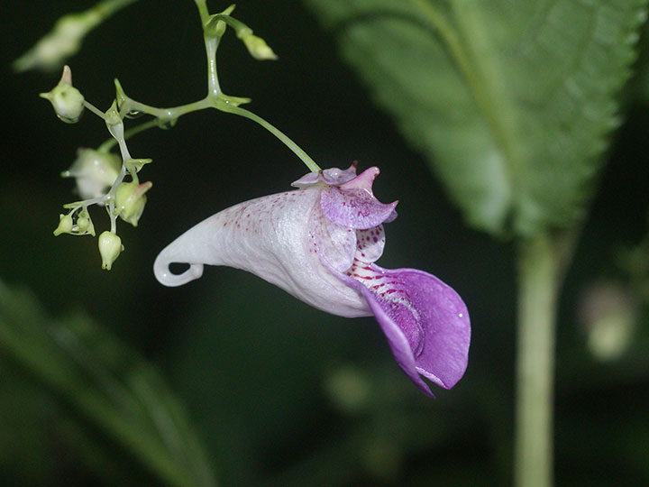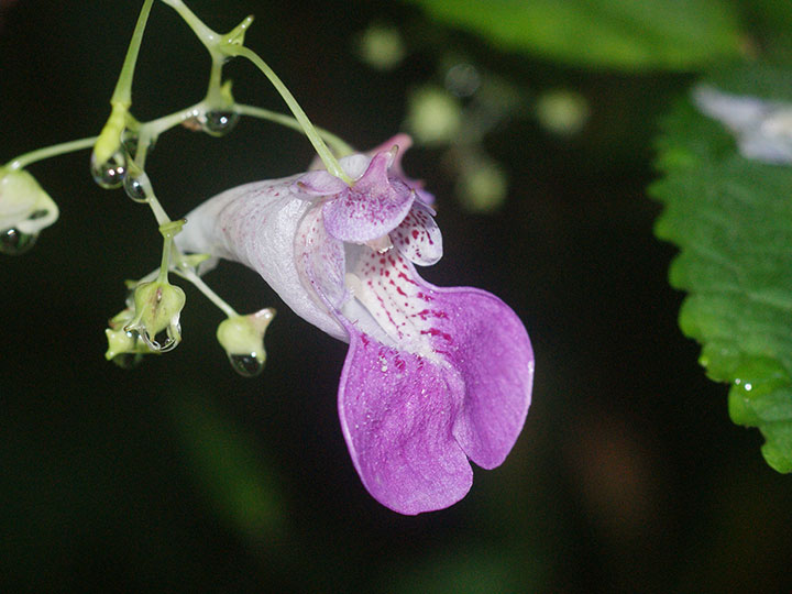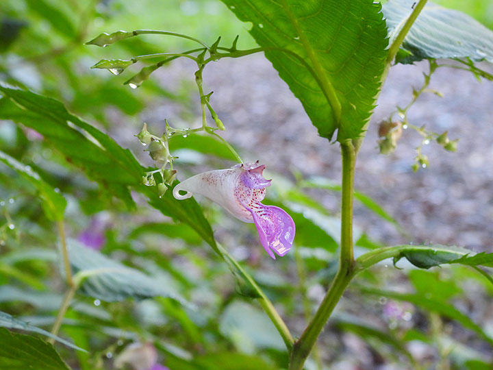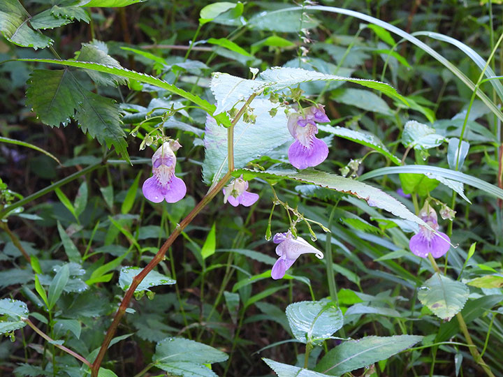 山地の水辺や林内に生育する1年草。茎は多汁質で,高さ 30 - 80 cm。葉は互生し,柄は短く,葉身は菱状楕円形で,長さ 4 - 13 cm,幅 2 - 5 cm,先はとがり,基部は鈍形,円形または心形になり,縁に鋸歯があり,両面の脈上に白色の縮れ毛がある。花序は葉腋から出てすぐ曲がって,葉の裏に隠れるように下垂する。花は長さ 25 - 35 mm,淡紅紫色で,紫色の斑点がある。距は前方に曲がるが,渦巻状にはならない。 花期:7 - 10 月 分布:本州(紀伊半島)・四国・九州 Impatiens ツリフネソウ属の花: キツリフネ ツリフネソウ ハガクレツリフネ |