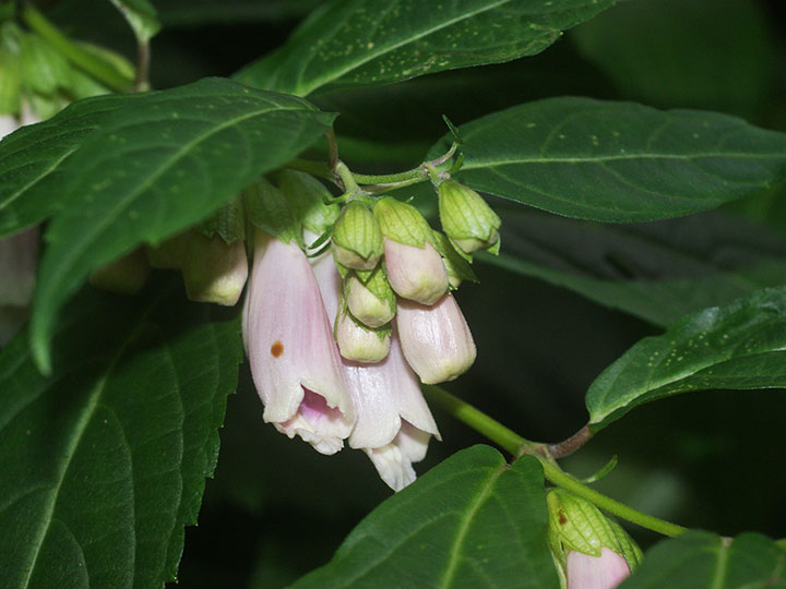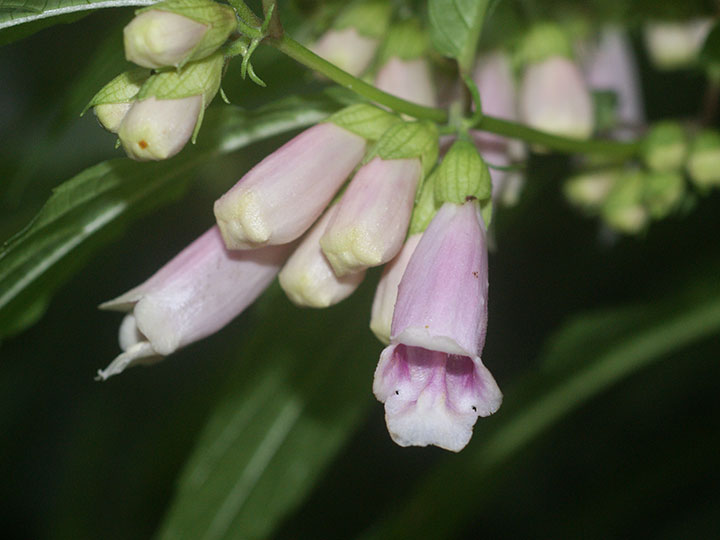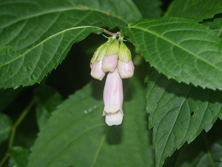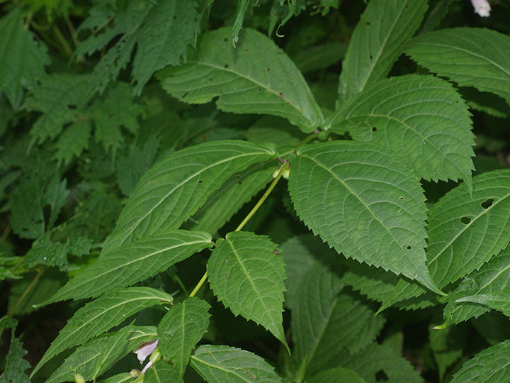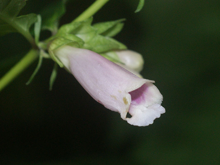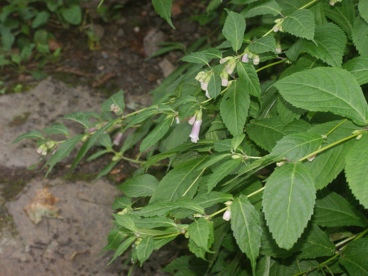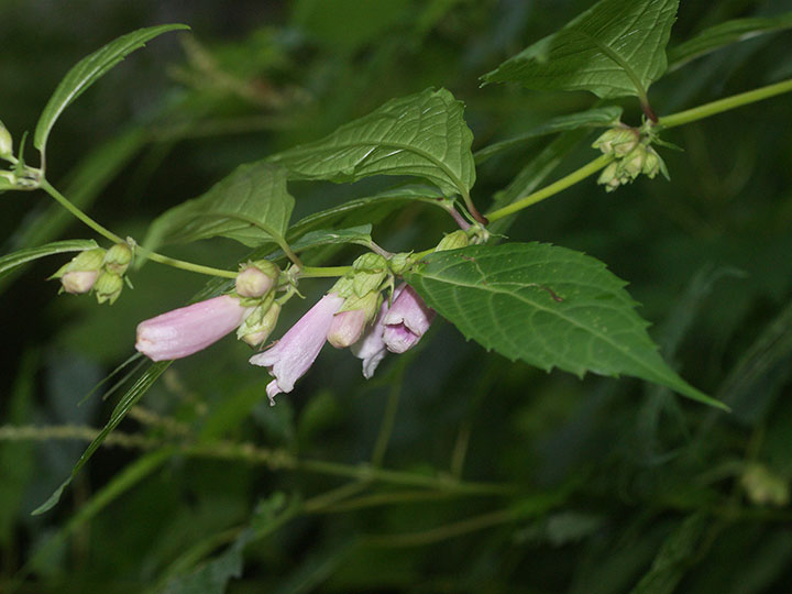 山地の谷間に生育する多年草。高さ 60 - 100 cm。茎は四稜形,分枝せず,多くは斜めに傾く。葉は対生し,狭倒卵形 - 広倒披針形,長さ10 - 20 cm,幅 3 - 10 cm。鋭尖頭,基部は幅が狭くなり耳状心形 - 耳状切形,縁には粗い鋸歯がある。葉柄は長さ3 - 10 mm。花は上部の葉腋から短い花序柄を出し,1 - 3個の筒状の唇形花をつける。小花柄は長さ2 - 7 mm。萼は緑色,鐘形,長さ10 - 15 mm,果時には長さ15 - 18 mmとなる。花冠は長さ4 - 4.5 cm,筒形,浅い2唇形,淡紅色,上唇は短く反り返り,下唇は小さく3裂する。分果は楕円形で長さ 7 - 8 mm。 花期:8 - 9月 分布:北海道・本州・四国・九州 Chelonopsis ジャコウソウ属: ジャコウソウ タニジャコウソウ |