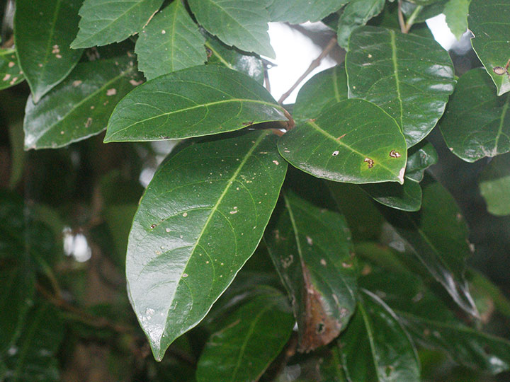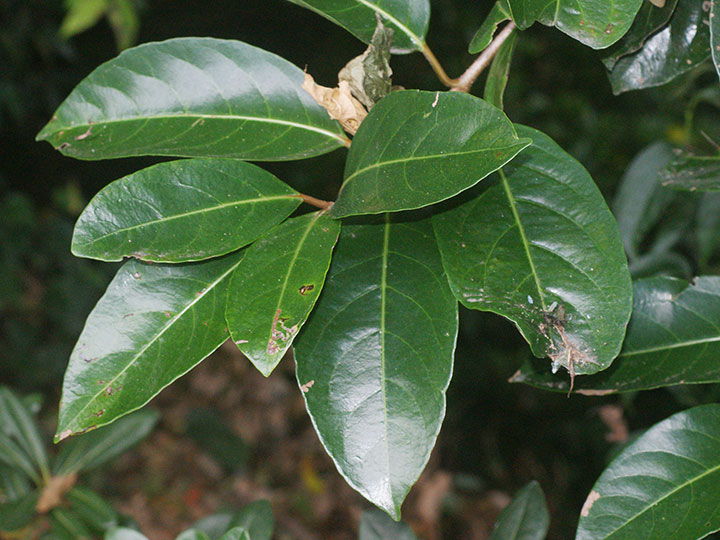 沿海地の山地に生育する常緑高木。高さ 5 - 20m。樹皮は灰褐色。葉は対生し,葉身は楕円形 - 長楕円形,長さ 7 - 20 cm,幅 4 - 8 cm,鋭頭 - 円頭,基部はくさび形,ほぼ全縁かやや波状鋸歯縁,革質で,表面は暗緑色で光沢があり,裏面は明るい緑色。葉柄は長さ1 - 3 cm,赤色を帯びる。枝先に長さ5 - 16 cmの円錐花序を出し,白色花を多数つける。萼は小さく,長さ1 - 1.5 mm,裂片は5個で緑色。花冠は直径 6 - 8 mm,筒部は長さ3 - 4 mmの鐘形,先端が浅く5裂 する。雄ずいは5個,花冠から突き出る。花糸は糸状,白色で長さ 2.5 - 3 mm,葯は長楕円形,黄色で長さ1.5 - 2 mm。子房は緑色,長さ1 - 2 mm。花柱は緑色で,長さ1 - 1.5 mm,柱頭は3裂する。果実は核果で,楕円形 - 卵形,長さ7 - 9 mm,9 - 10月頃赤くなり,後に藍黒色に熟す。 花期:6 - 7月 英名:sweet viburnum 分布:本州(関東地方南部以西)・四国・九州,沖縄;朝鮮半島南部,中国,台湾 Viburnum ガマズミ属の花: オオカメノキ オトコヨウゾメ ガマズミ コバノガマズミ サンゴジュ チョウジガマズミ ハクサンボク ミヤマガマズミ ヤブデマリ ヤマシグレ |