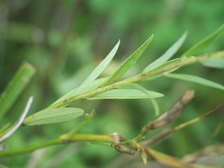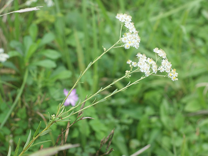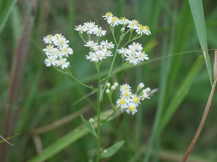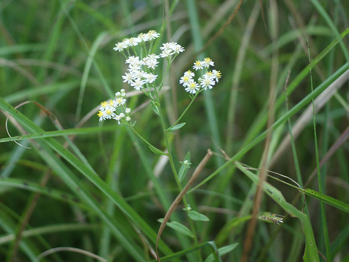 草原や小川の縁などに小さい群落を作って生育する多年草。茎は高さ30 - 100 cmで直立し,上部で分枝する。葉は線状披針形または披針形,やや厚い洋紙質。下部の葉は 5.5 - 12 cm,幅 4 - 15 mm,上部のものほど小さくなる。縁には短毛があり,裏面は緑白色で短毛と腺点がある。茎頂に密な散房花序を作る。頭花は径 7 - 9 mm。花柄は細く,3 - 8 mm。総苞は筒型で長さ 4 mm,密に細毛がある。舌状花は白色で1列,筒状花は長さ 4.5 mm。そう果は長楕円形,長さ 1.2 mm,幅 0.6 mm,わずかに扁平で,短毛と腺点がある。冠毛は多数で長さ 4 mmで,ほぼ同長。 花期:8 - 10 月 分布:本州・四国・九州;朝鮮半島・中国・ロシア南部 Aster シオン属の花: イソノギク オオバヨメナ オオユウガギク コシキギク ゴマナ サツマシロギク シラヤマギク シロヨメナ ケシロヨメナ センボンギク ソナレノギク (タニガワコンギク) ダルマギク ナガバシロヨメナ ノコンギク ハマベノギク ヒメシオン ブゼンノギク ヤマジノギク シュウブンソウ Tripolium ウラギク属: ウラギク |