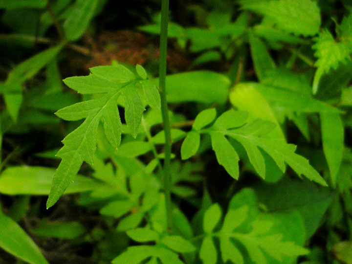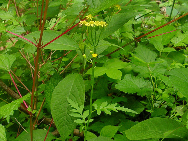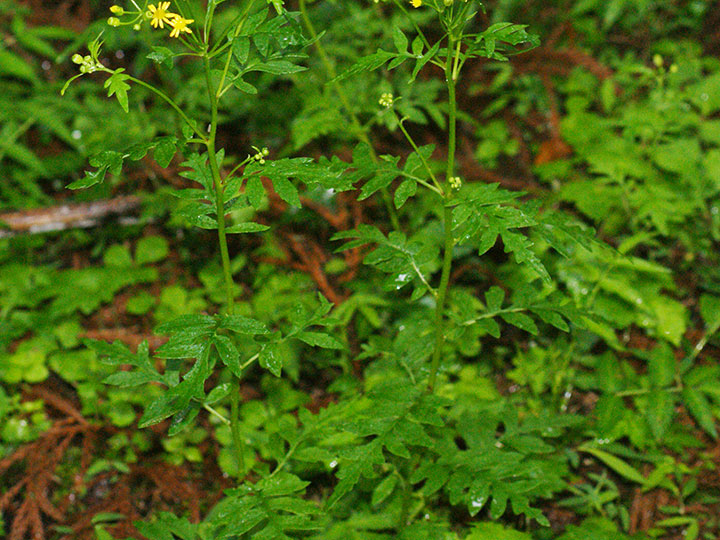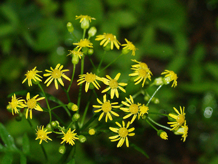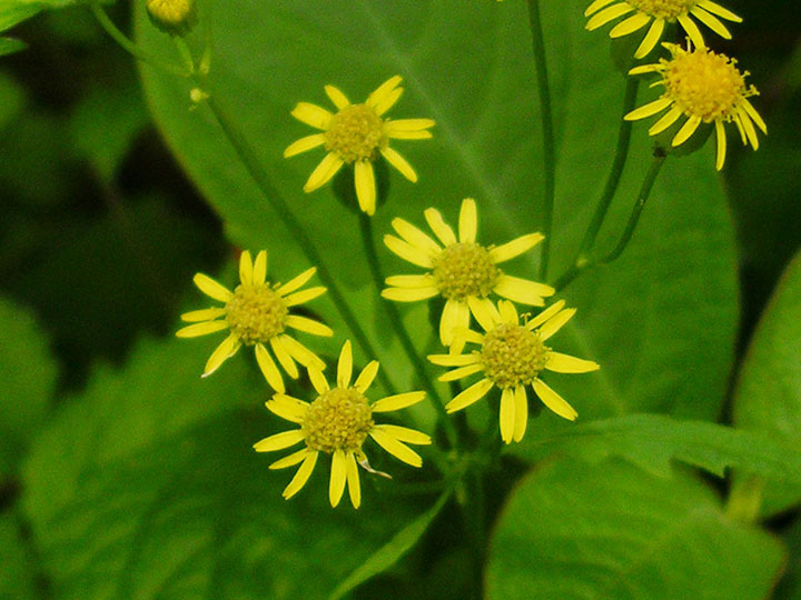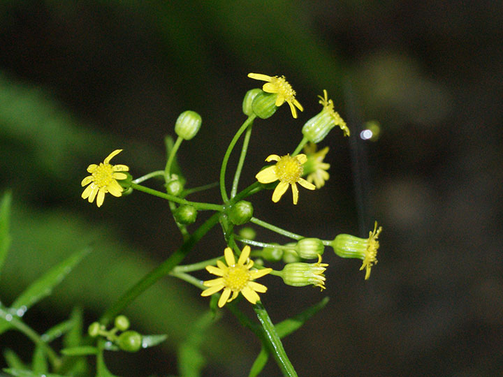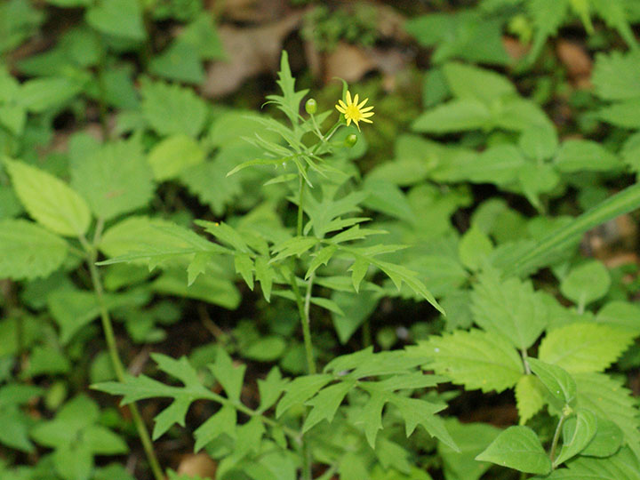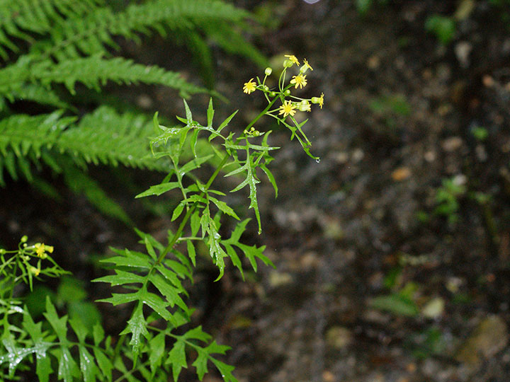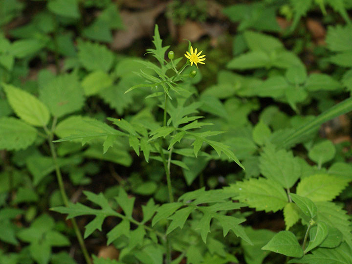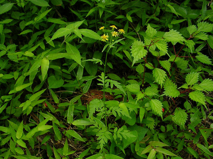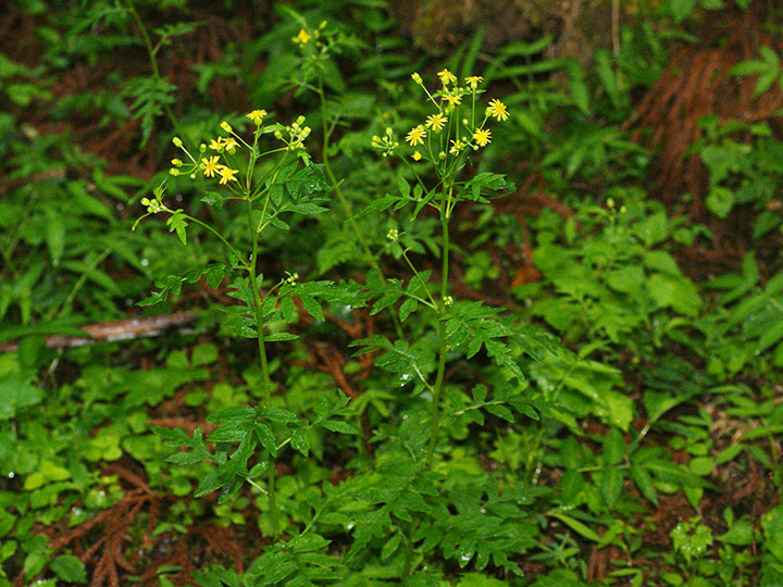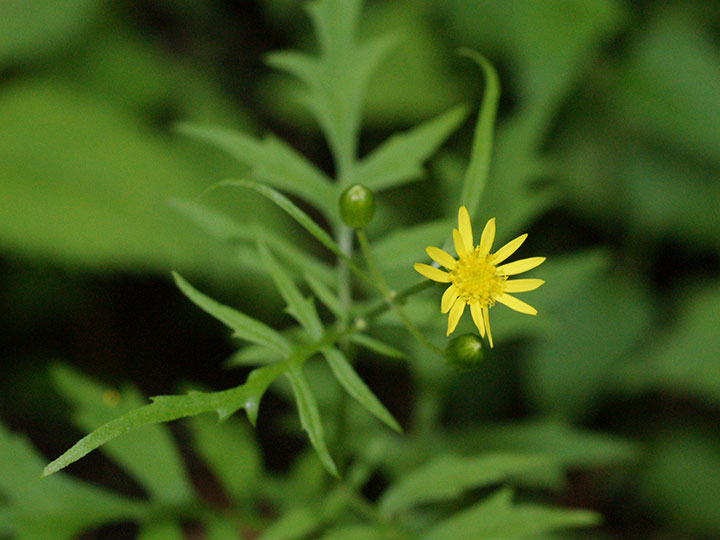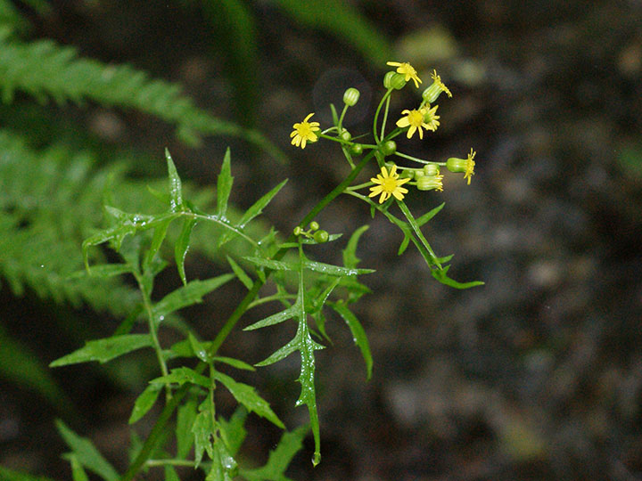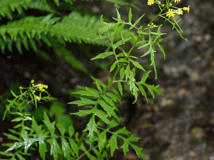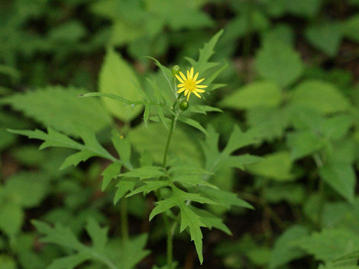 山地の湿り気のある木陰に生育する多年草。高さ 30 - 100 cm。茎は中空の円筒形,柔らかく折れやすく,直立し,上部で分枝し,下部は角張ってまばらに白毛が生える。根出葉は密に白毛がある。根生葉がロゼットを形成して冬を越すが,花時にはない。茎葉は互生し,薄く,長さ 4 - 15 cm,幅 2 - 7 cm,羽状に深裂し,葉の裂片は 4 - 6対,先は尖り,両面まばらに毛がある。枝の先に径約1.2 cmの頭花がやや散状に多数つく。花柄は細く,苞はない。総苞は長さ約 5 mm,総苞片は長披針形で1列につく。舌状花は 7 - 13個,舌状花冠は黄色で,長さ 8 mm,幅 1 mm。筒状花も黄色。そう果は長さ 1.5 mmで細毛がある。冠毛は雪白色。 花期:6 - 8 月 別名:ボロギク(襤褸菊) 分布:北海道・本州・四国・九州 |