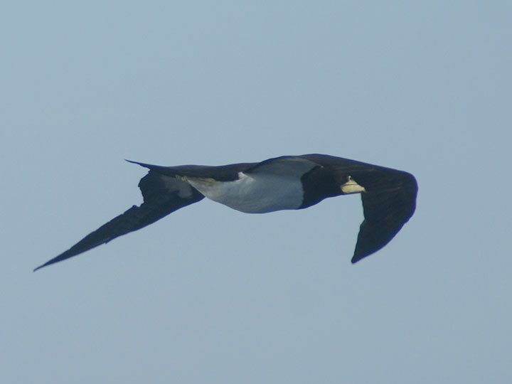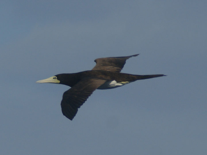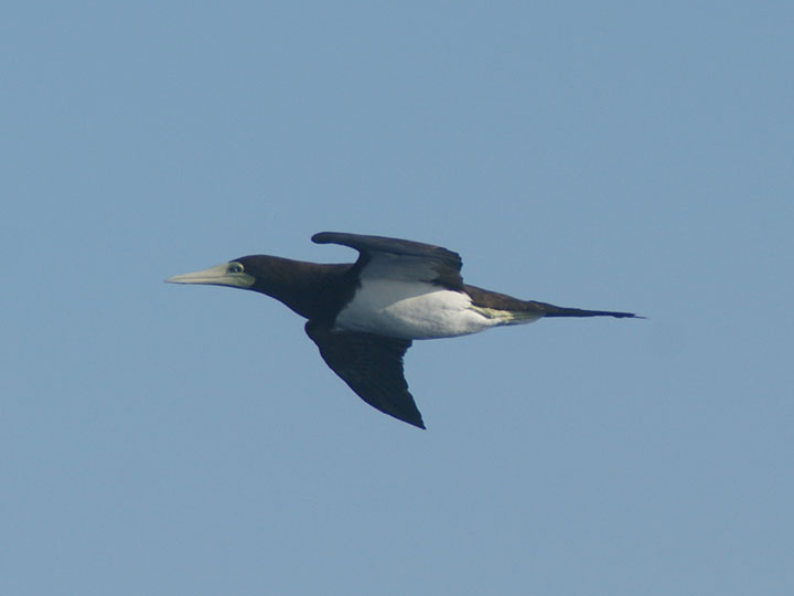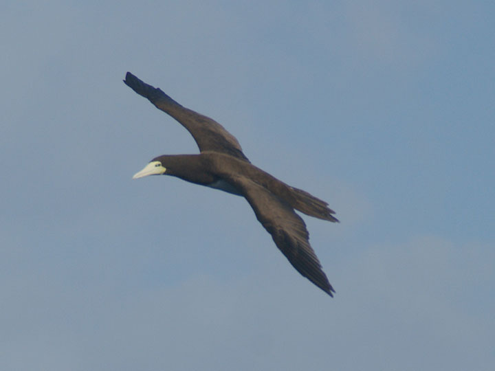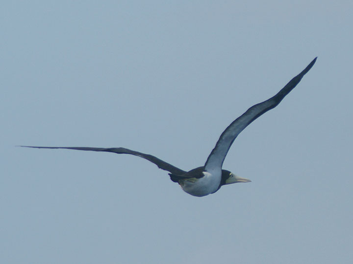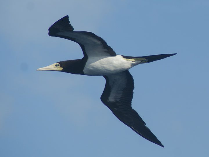 熱帯,亜熱帯海域に棲息する大きな海鳥で長い翼と尾を持つ。体の上面,翼の上面は黒褐色,翼下面の基部は白色,風切が黒く,雨覆は白色。腹部や尾羽基部下面は白い羽毛で被われる。嘴や後肢は淡黄色。顔の裸出部は雄では青色,雌では黄白色。食性は動物食で,魚類,軟体動物を食べる。比較的高い空を滑翔しながら獲物を探し,獲物を発見すると急降下して潜水し捕らえる。繁殖期は3 - 8月。集団繁殖地を形成し,海岸にある断崖や草原などを集団繁殖地とし,枯草や木の枝を組み合わせた皿状の巣を作り,1-2個の卵を産む。雌雄交代で抱卵し,抱卵期間は約43日。雛は孵化してから85-105日で巣立つ。 全長 約 70 cm 翼開長 約 140 cm 鳴き方:繁殖地で「グワッ,グワッグワッグワッ」 英名:Brown Booby 分布:伊豆諸島,硫黄列島,小笠原諸島,八重山諸島,尖閣諸島で繁殖; インド洋,太平洋西部及び中東部,カリブ海,南部大西洋 カツオドリ科 Sulidae カツオドリ属 Sula :カツオドリ |