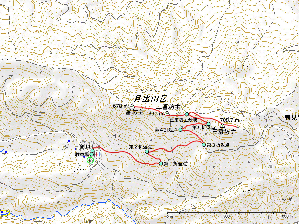 2026年1月4日(日) 北九州 - 国道200号 - 鯰田工業団地入口 - 県道421号 - 県道415号 - 県道402号 - 山田川 - 稲築郵便局前 - 国道211号 - 小石原 - 9:28 道の駅「小石原」 - 国道211号 - 県道671号 - 国道212号 - 日田 - 県道672号 - 市道 - 10:40 月出山岳登山口・駐車場 10:57 月出山岳登山口・駐車場 (420 m) - 10:57 月出山岳登山口 (420 m) - 11:20 第1折返点 (520 m) - 11:20 第1折返点 (520 m) - 11:25 第2折返点 (540 m) - 11:42 第3折返点 (600 m) - 11:50 第4折返点 (630 m) - 11:58 第5折返点 (660 m) - 12:07 三番坊主分岐 (675 m) - 12:10 MCA中継アンテナ (690 m) - 12:17 一番坊主 (678 m) - 12:33 二番坊主 (690 m) - 12:07 三番坊主分岐 - 13:06 月出山岳山頂・三番坊主 (708.7 m) - 13:17 三番坊主分岐 - 13:20 第5折返点 - 13:25 第4折返点 - 13:29 第3折返点 - 13:40 第2折返点 - 13:43 第1折返点 - 13:48 竹林 - 14:02 登山口 - 14:02 駐車場 月出山 - 県道672号 - 日田 - 国道212号 - 県道671号 - 国道211号 - 15:17 道の駅「小石原」 - 国道211号 - 県道421号 - 稲築郵便局前 - 県道402号 - 県道415号 - 県道421号 - 鯰田工業団地入口 - 国道200号 - 北九州 |