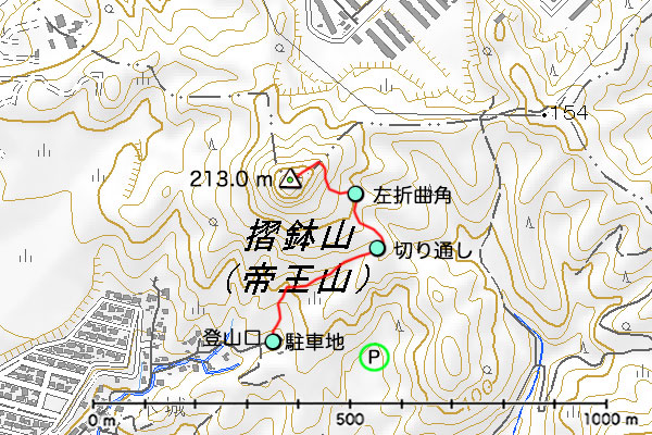 北九州 - 国道200号 - 県道22号 - 国道201号 - 田川 - 県道420号 - 後藤寺 - 県道322号 - 猪国 - 嘉麻市上山田 - 11:45 帝王山(摺鉢山)登山口 12:02 登山口 (80 m) - 12:12 切り通し 12:15 左折曲角 (130 m) - 12:22 左折曲角 (150 m) - 12:33 標高 200 m地点 - 12:36 摺鉢山山頂 (213.0 m)・昼食 12:56 - 13:18 標高 150 m地点 - 13:25 切り通し- 13:36 摺鉢山登山口 摺鉢山登山口 - 県道443号 - 14:11 道の駅「うすい」 - 県道443号 - 県道473号 - 飯塚 - 国道200号 - 北九州 |