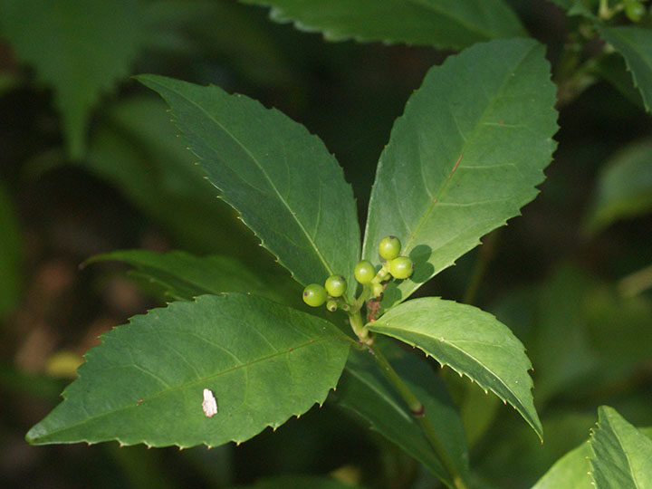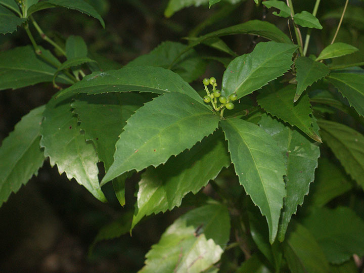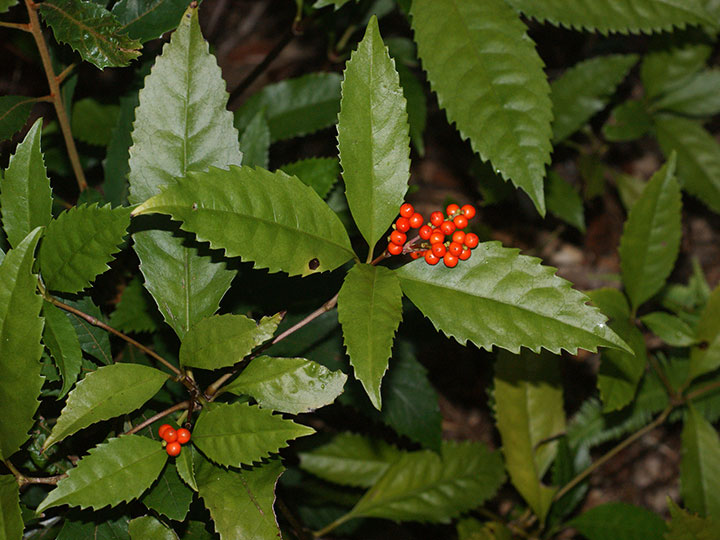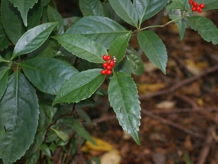 常緑広葉樹林の林床に生育する常緑低木。茎は直立してまばらに分枝し,高さ 70 - 100 cm,全体無毛。葉は対生し,楕円形または卵状披針形,長さ 6 - 17 cm,幅 2 - 6 cm,鋭尖頭,縁に鋭い鋸歯があり,基部はくさび形,革質で,光沢がある。葉柄は長さ 0.5 - 2 cm,基部は茎を抱く。枝先に2 - 3回分枝する,長さ 2 - 4 cmの穂状花序を伸ばし,まばらに多くの黄緑色の花をつける。苞は3角状で先がとがり,長さ約 1 mm。花は両性花,花被がなく,苞の腋につく。雌ずいは球形,緑色,長さ 1 - 1.5 mm,その背軸側に雄ずいが直接ついて横に張り張り出している。雄ずいは1個,円柱形で,葯は黄色で2個。核果は球形,直径 3 - 5 mm,朱赤色に熟す。 花期:6 - 7月 果期:11 - 1月 分布:本州(関東地方南部,東海地方,紀伊半島)・四国・九州,沖縄;朝鮮半島, 中国(東南部),台湾,東南アジア |