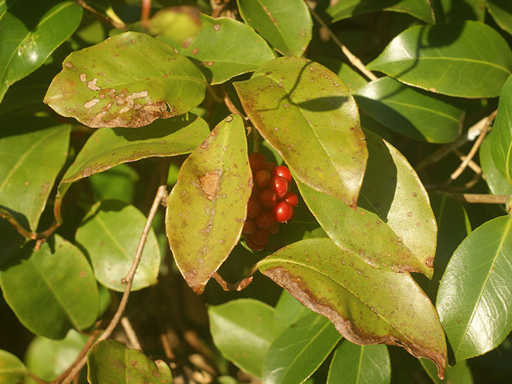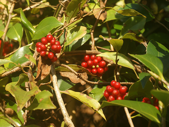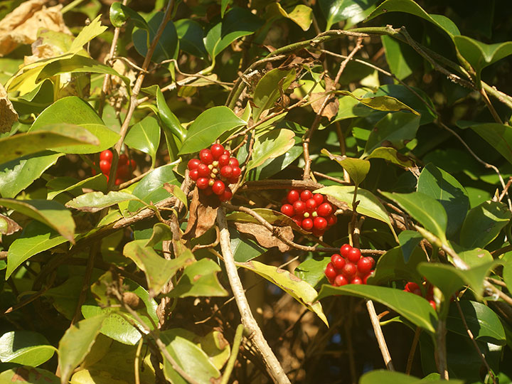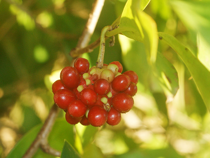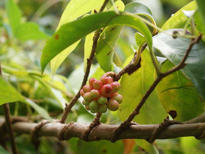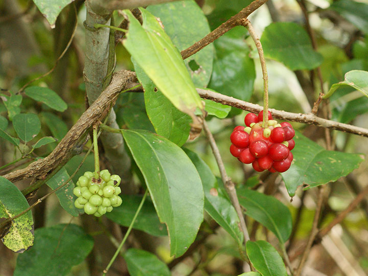 山地の林縁に生育する常緑のつる性木本。古い茎はコルク層が発達し,太く,径約 2 cmになる。枝には粘液が多く,新枝は赤褐色を帯びる。葉は互生し,長さ 5 - 13 cm,幅 2 - 6 cmの長楕円形または卵形,先は多少尖り,基部はくさび形,まばらに低い鋸歯があり,質は革質,表面はやや光沢があり,裏面は色淡く,しばしば赤色を帯び,両面とも無毛。葉柄は長さ約 1 cm。雌雄別株または同株。葉腋に1個,稀に2 - 4個の花がつく。花は鐘形,径約1.5 cm,長い花柄があり,垂れ下がって咲く。花被片は黄白色で 8 - 17個,楕円形 - 倒卵形,外側のものは大きく,長さ10 - 14 mm,内側のものは長さ7 - 10 mm。雄花の雄ずいは球状につき,赤色の葯隔が横に広がり,小さな白色の葯が葯隔の両側につく。雌花は中心部が淡緑色。雌花は花後花床が球状にふくらみ,果実となる。果実は集合果で,直径 2 - 3 cmの球形,11月に赤く熟す。種子は腎臓形,長さ 5 - 6 mm。 別名:ビナンカズラ 花期:8 - 9月 英名:false schisandra, Japanese kadsura 分布:本州(関東地方以西)・四国・九州,琉球;済州島,台湾,中国 |