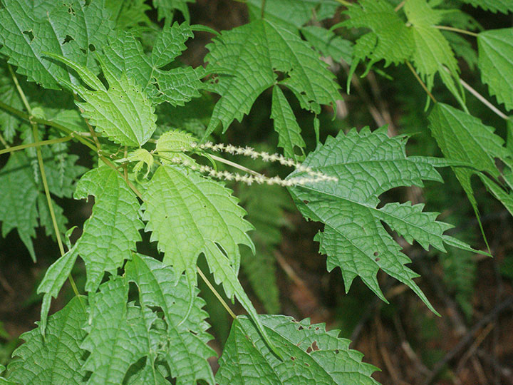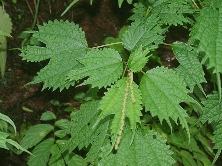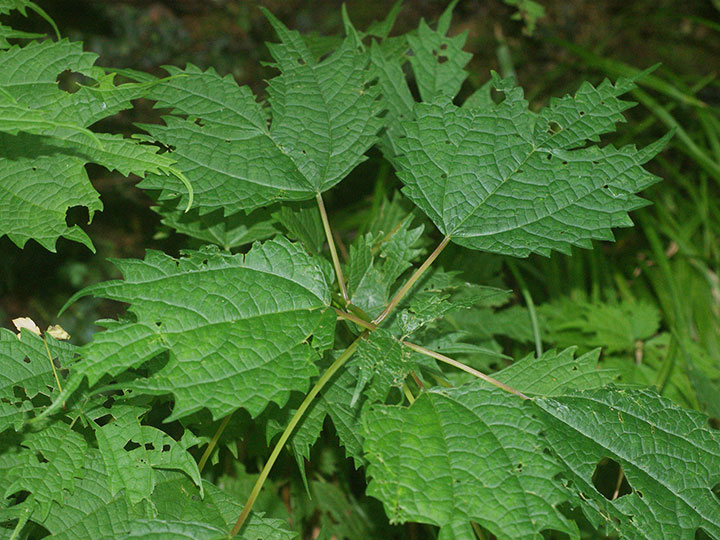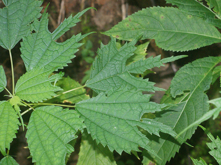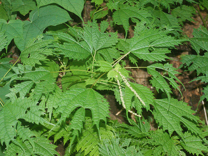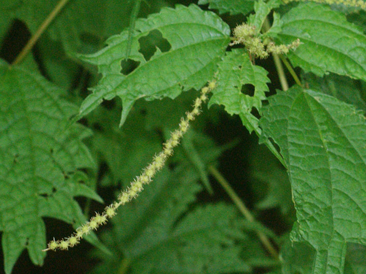 山野のやや湿った所に生育する多年草。高さ 50 - 80 cm。茎はそう生し,分枝は少なく,斜めに立つことが多い。茎や葉柄は赤褐色を帯び,全体に無毛か微毛がある。茎は木質化しない。葉は対生し,卵円形で,3主脈があり,長さ 8 - 15 cm,縁にあらい鋸歯があり,先は大きく3裂し,中央の裂片は尾状に長く伸び,基部は切形または広いくさび形になり,3主脈が目立ち,両面にまばらに寝た毛がある。雌雄同株。雄花序は茎の下部の葉腋につき,淡黄白色の雄花を穂状につける。雄花の花被片と雄ずいはそれぞれ4個。雌花序は茎の上部に葉腋につき,雄花序より小型で赤みを帯びる。雌花は球形に集まり,この雌花の集団がやや接して花軸につく。花柱は長さ 1.5 mm。そう果は全面に微毛があり,長さ約 1.5 mm,扁平で狭い翼があり,全面に短毛がある。 花期:7 - 9月 分布:北海道・本州・四国・九州;朝鮮半島,中国 Boehmeria カラムシ属: アカソ カラムシ コアカソ ナガバヤブマオ ヤブマオ |