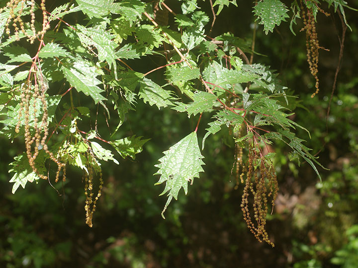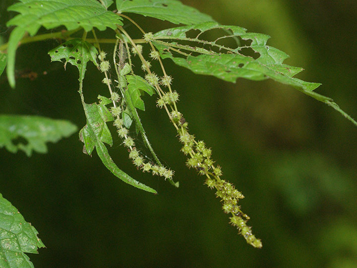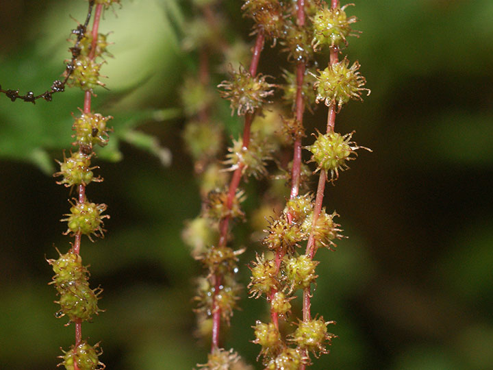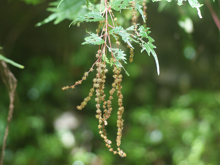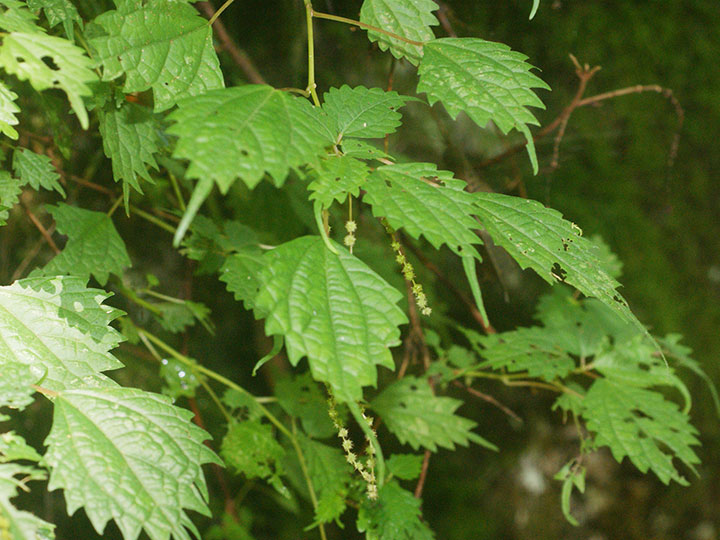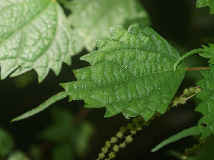 山地や道端に生育する落葉性半低木。茎は下部が木質化し,多数分枝して,高さ1 - 2 mになり,赤褐色を帯びるものが多い。葉は対生し,菱状卵形,長さ4 - 8 cm,先は尾状にとがり,基部はくさび形,縁に深い鋸歯があり両面にまばらにねた短毛がある。葉柄は葉身とほぼ同長,托葉は線形,長さ 4 mm。雌雄同株。葉腋から穂状花序が垂れる。雄花序は黄白色,雌花序より下の葉腋につく。雌花序は赤色を帯び,茎上部の葉腋につく。そう果は長さ約1.3 mmの倒卵形,全面に微毛がある。 花期:8 - 10月 別名:タニアサ 分布:本州・四国・九州;朝鮮半島,中国 Boehmeria カラムシ属: アカソ カラムシ コアカソ ナガバヤブマオ ヤブマオ |