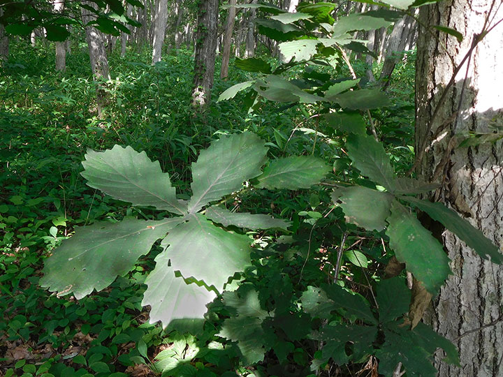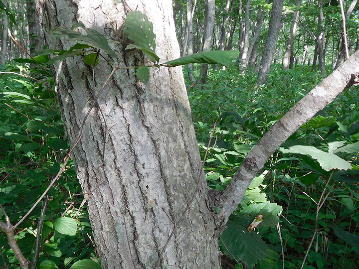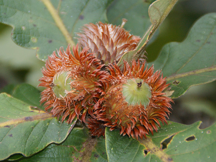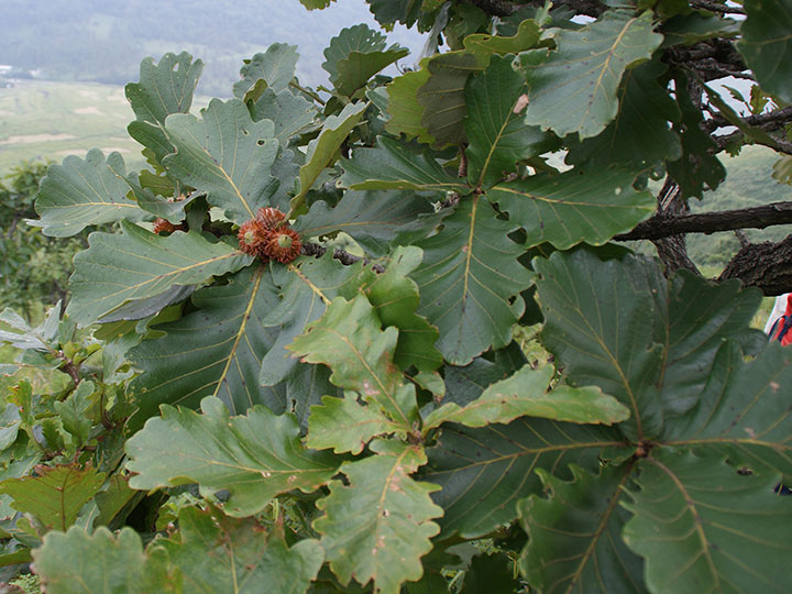 山野や沿海のやせ地や礫地に生育する落葉高木。高さ15m,直径 60 cmに達する。樹皮は灰褐色 - 黒褐色,縦に不規則な深い割れ目が入る。若枝は縦に溝があり,灰褐色の短毛と星状毛を密生し,円い皮目を散生する。葉は枝先に集まって互生し,葉身は長さ12 - 32 cm,幅6 - 18 cmの倒卵状長楕円形で,先端は鈍く,基部はやや耳状にはりだし,ふちには波状の大きな鋸歯がある。洋紙質で,表面にははじめ短毛や星状毛があるが,のちに無毛,裏面は灰褐色で短毛と星状毛が密生する。葉柄はごく短い。葉は秋に枯れても,新芽が出るまで,落葉しない。托葉は長さ1.4 - 1.8 cmの線形,早落性。雌雄同株。葉の展開と同時に開花する。雄花序は新枝の下部に多数ついて下垂し,長さ10 - 15 cmで,淡褐色の軟毛を密生する。苞葉は線形,長さ約 1.8 mmあり,1花を腋生する。雄花序は長さ10 - 15 cm,新枝の下部から垂れ下がる。雄花は直径約 2 mm,花被は膜質で,6深裂する。雄蕊は 8 - 14個で,葯には微毛がある。雌花は新枝の上部の葉腋に5 - 6個つく。花柱は3個。堅果は卵球形で,長さ1.5 - 2 cm あり,無毛でその年の秋に熟す。殻斗は杯状,径 2.5 - 4.5 cmで,総苞片は多数,下部のものは卵状披針形,上部のものは線状披針形で,らせん状に密生して反り返り,灰白色の短毛を密生する。 花期:5 - 6月 英名:daimyo oak , Japanese emperor oak 分布:南千島,北海道・本州・四国・九州;ウスリー,朝鮮半島,中国,台湾 Quercus コナラ属: アラカシ カシワ クヌギ コナラ シラカシ |