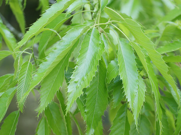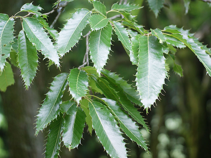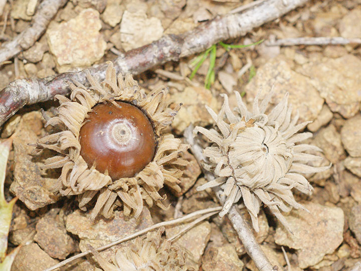 丘陵や山地野の向陽地に生育する落葉高木。高さ15 m,直径60 cmに達する。樹皮は灰褐色,厚くて,縦に不規則な裂け目がある。若枝は灰白色の短毛を密生するが,翌年にはほぼ無毛となり,円い皮目を散生する。葉は互生し,葉柄は長さ1 - 3 cm,長楕円状披針形,長さ 8 - 15 cm,先は鋭尖形まれに鈍形,基部は円く,洋紙質で,側脈は13 - 17対。葉の表面ははじめ軟毛があるがしだいに無毛となる。葉の裏面は黄褐色の脱落性軟毛を密生するが,のちには中脈や側脈に毛を散生するのみで,淡い緑色となる。葉縁にやや深い波状の鋸歯があり,鋸歯の先端に長さ2 - 3 mmの針状の長い刺がある。托葉は早落性,線形で長さ約12 mm。雌雄同株。葉の展開と同時に開花する。本年枝の下部から黄褐色で長さ 7 - 8 cmの雄花序を垂らし,雄花は杯形で,ほとんど柄がなく,径約 2.5 mm,花被は膜質で,3 - 5深裂し,直径約 2.5 mm。雄ずいは3 - 6個。雌花は新枝の中部から先の葉腋に1 - 3個つく。花柱は3個。堅果は球形,径 2 - 2.3 cm,無柄で,翌年の秋に熟す。穀斗は半球形,径 3 - 3.5 cm,総苞片は広線形でらせん状に密につき,反り返り,灰白色の短毛を密生し,上部のものほど長く,長さ約1 cmになる。 花期:4 - 5月 分布:本州(岩手・山形県以南)・四国・九州,沖縄;朝鮮半島,中国,台湾,東南アジア,ヒマラヤ Quercus コナラ属: アラカシ カシワ クヌギ コナラ シラカシ |