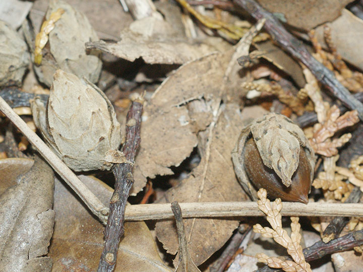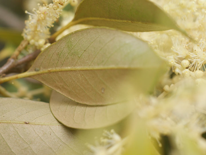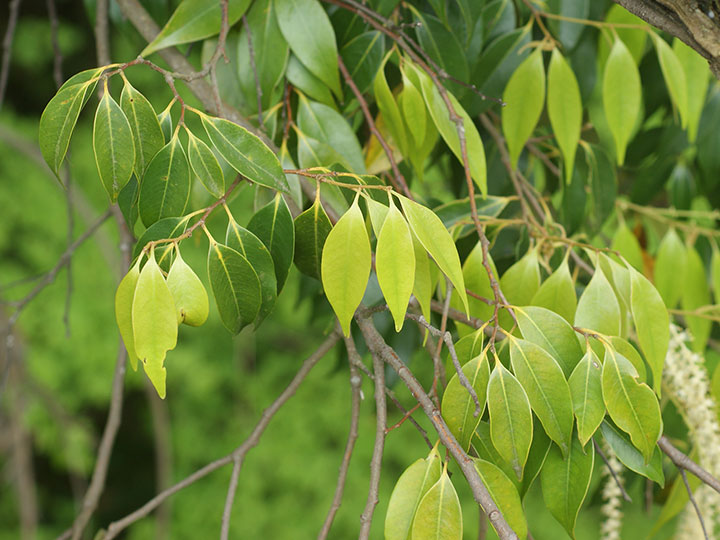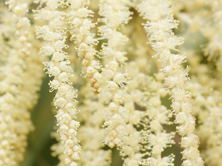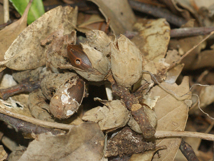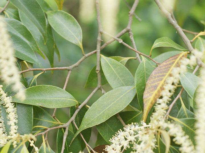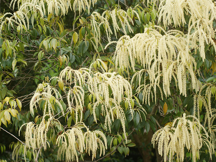 平地から山地に生育する常緑高木。高さ約 20 m,直径約 1 mになる。幹は上部でよく分枝し,多数の葉を茂らせ,大きな円形の樹冠をつくる。樹皮は黒褐色,縦の深い割れ目が入る。若枝は褐色をおびた灰緑色で,円形または楕円形の小さな皮目が多い。冬芽はやや扁平な長楕円形。葉は互生し,長さ約1 cmの葉柄があり,2列に並び,やや斜め下方につく。葉身は長さ5 - 15 cm ,幅2.5 - 4 cm の広楕円形で,先端は急に細くなって鈍頭に終わり,基部は広いくさび形または円形,全縁または上半部に波状の鋸歯が少しある。やや厚い革質で,葉の表面は光沢のある深緑色または緑色,葉裏は灰褐色の細かい鱗状の毛を密生し,銀白色のちに灰褐色となる。托葉は早落性。雌雄同株。花期には強い香りを発散する。雄花序は長さ 8 - 12 cm ,新枝の下部から上向きにのびるが,先端は下垂する。苞は早落性,半円形で膜質。雄花は半球形で,径約 3 mm,花被片は6個でほぼ離生し,楕円形,黄緑色。雄ずいは10 - 12個。雌花序は長さ6 - 10 cm ,新枝の上部の葉腋から直立し,雌花が多数つく。苞は半円形で,1個の総苞を腋生する。雌花は球形で径1 cmほど,花被片は6個,花柱は3個。堅果は卵状長楕円形,長さ 12 - 20 mm,翌年の秋に成熟する。穀斗は卵形,先は鋭形,鱗片状突起は合着するが,先端部のみは離生し,環状に配列する。成熟すると殻斗は3裂し,なかから堅果が顔をだす。 花期:5 - 6月 別名:イタジイ,ナガジイ 分布:北本州(福島・新潟県以西)・四国・九州,屋久島;済州島 Castanopsis シイ属 : |