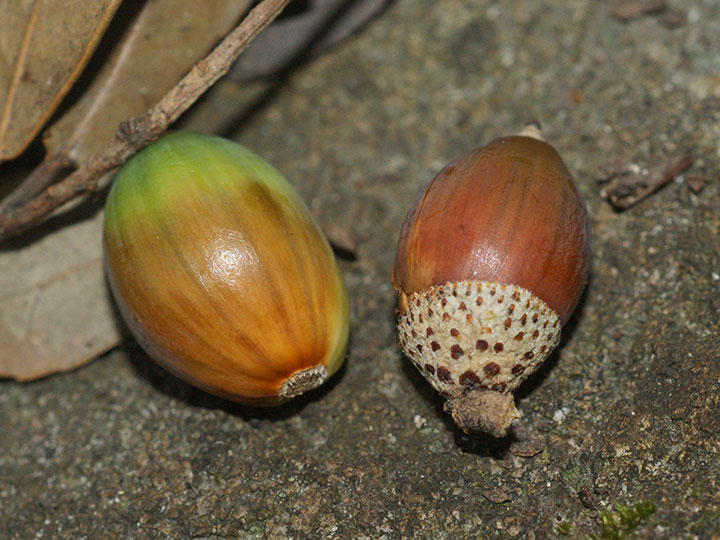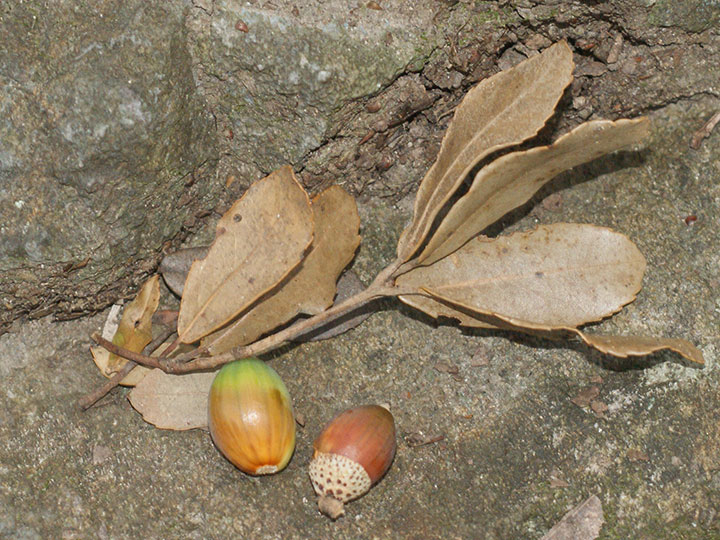 暖地の海岸近くの山地生育する常緑低木ないし小高木。高さは 3 - 5 m,大きいものは高さ10 m,直径 60 cmほどになる。樹皮は黒褐色で,老木では縦に浅い裂け目がある。本年枝は紫褐色。灰褐色の星状毛が密生するが,次年には無毛となり,円形の皮目が目立つ。冬芽は枝の先に集まる傾向があり,狭卵形。葉は互生し,葉柄は長さ約 5 mm,葉身は長さ 3 - 6 cm,幅 2 - 3 cmの楕円形で,先は鈍形または円形,基部は円形またはわずかに心形,厚い革質で,表面は光沢があり,裏面は淡緑色。両面ともはじめは主脈に星状毛と短毛があるが,のち無毛になる。托葉は長楕円形,早落性,長さ約 1 cm。雌雄同株。新葉の展開と同時に開花する。本年枝の下部から長さ 2 - 2.5 cmの雄花序が下垂し,花序の軸には星状毛が密生する。雄花の苞は倒披針形。雄花は苞腋に1個つき,杯形で,花被は膜質,淡褐緑色で,4 - 5中裂する。雄ずいは4 - 5個。雌花は新枝の上部の葉腋に1 - 2個つく。雌花には柄があり,花柱は3個。堅果は楕円形で,長さ約 2 cm,1年目はほとんど成長せず,翌年の秋に成熟する。穀斗は浅い杯形,径 1.2 - 1.5 cmで,総苞片は瓦重ね状に並び,長楕円形で,先は鈍形,褐色で,黄褐色の毛が密生する。 花期:4 - 5月 分布:本州(神奈川県以西の太平洋側)・四国・九州,沖縄;中国,台湾 Quercus コナラ属: アカガシ アラカシ ウバメガシ ウラジロガシ カシワ クヌギ コナラ シラカシ ミズナラ |