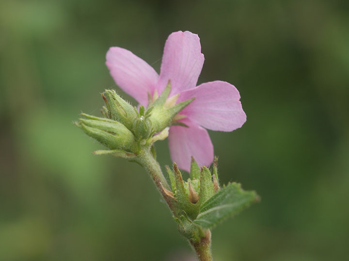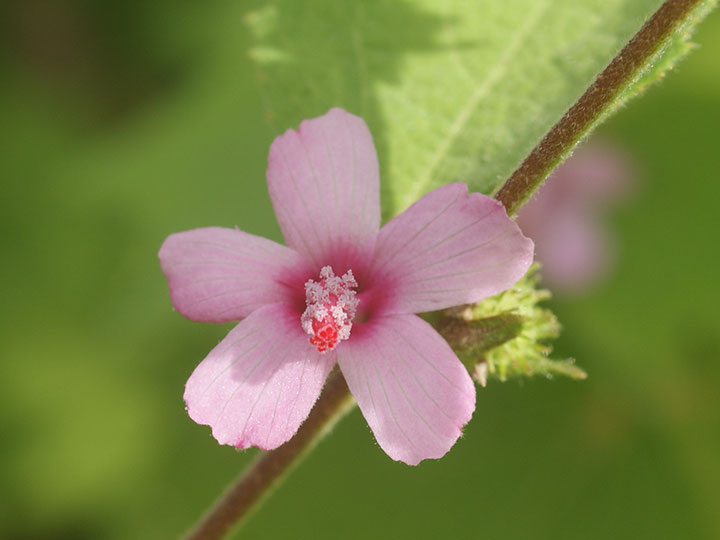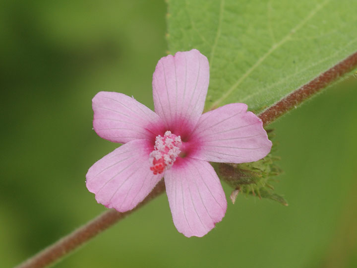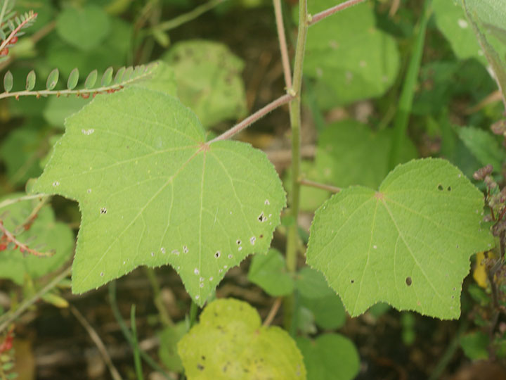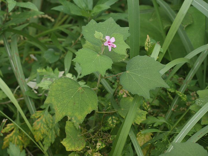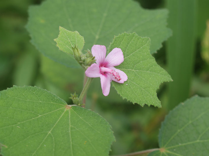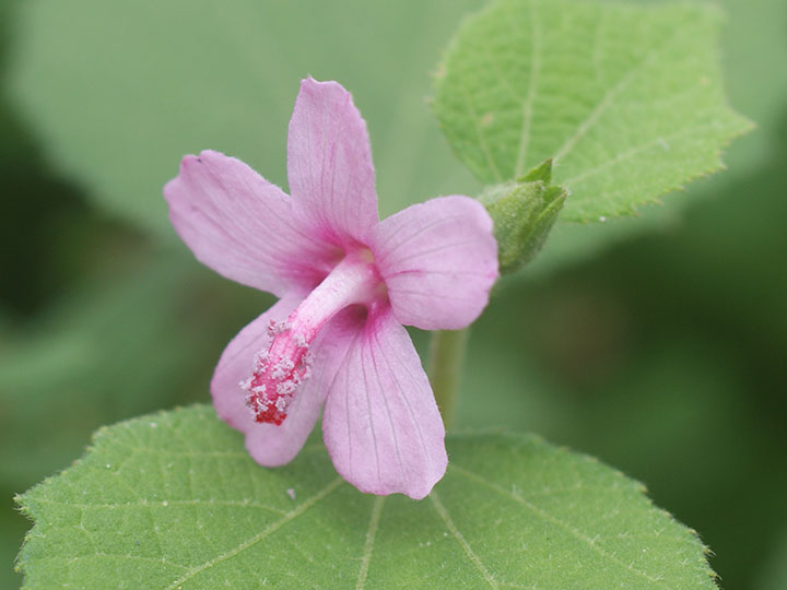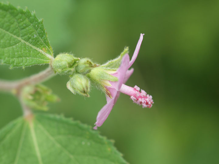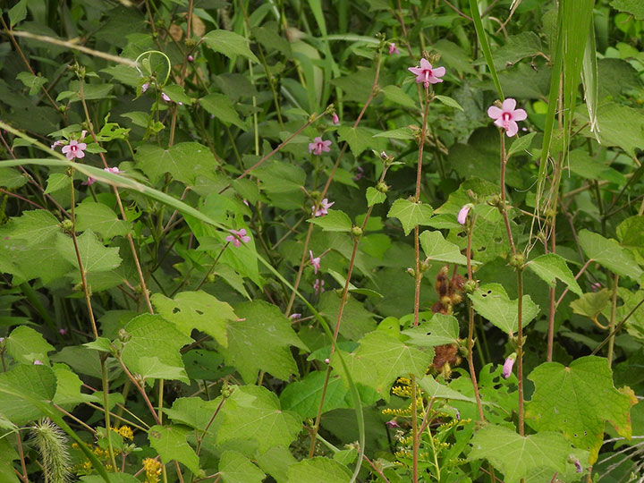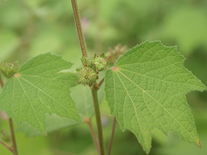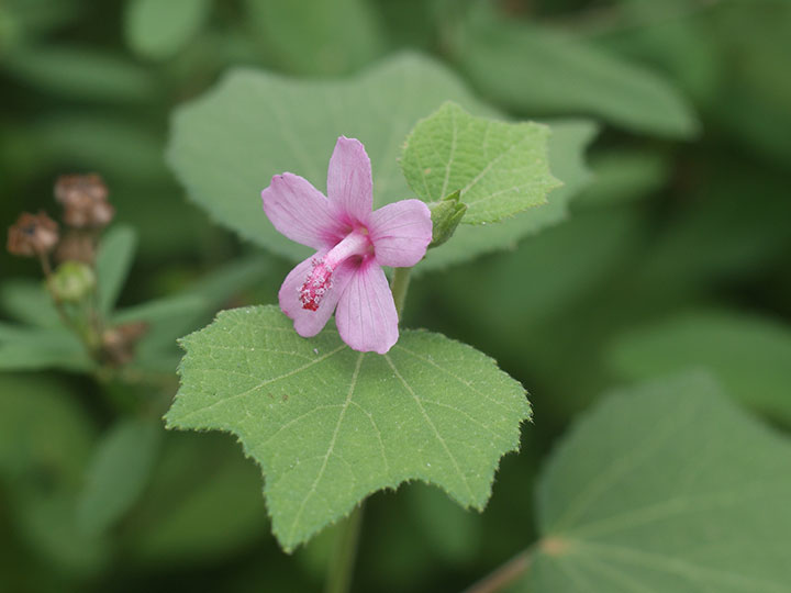 林縁などに生育する常緑多年草(亜低木)。高さ 60 - 150 cm。茎は直立して分枝する。葉は円形または広卵形で長さ 4 - 5 cm,浅く3 - 5裂し,裂片は幅広く,基部は浅心形,長さ 3 - 10 cmの柄がある。葉柄や葉の裏面に灰白色の星状毛が多い。花は葉腋にふつう1個つき,時に束生する。萼片は卵状披針形で長さ 4 - 6 mm,副萼片は披針形で萼片より長い。花は径約 2 cm,花弁は5個,淡紅色で中央部が紫色を帯びる。花糸はほとんど全部が合着する。さく果は径約 8 mm,外皮に刺状突起がある。種子は腎形,灰褐色で長さ約 4 mm。 花期:7 - 10月 分布:九州(大隈半島南部),南西諸島;台湾,熱帯各地 Urena ボンテンカ属: オオバボンテンカ ボンテンカ |