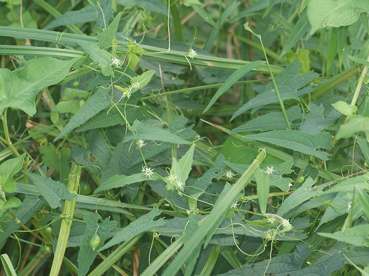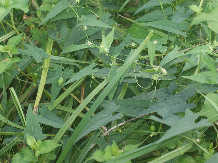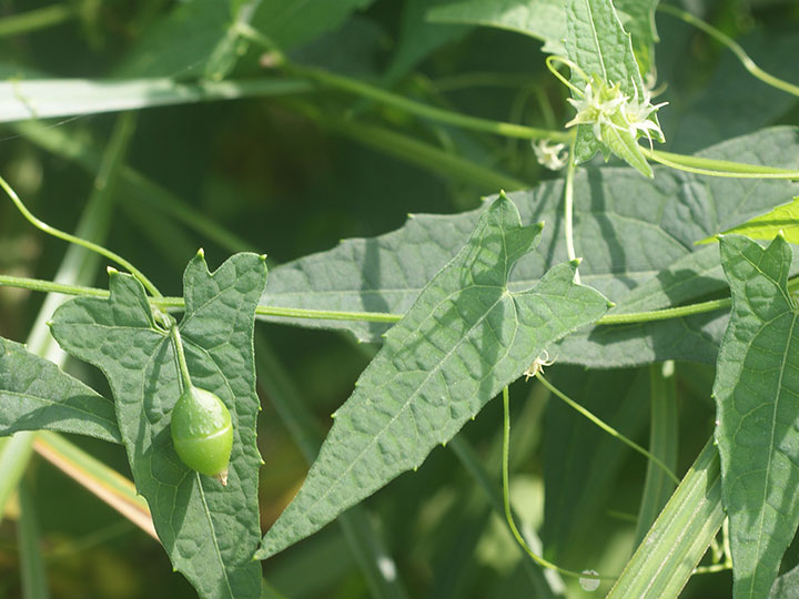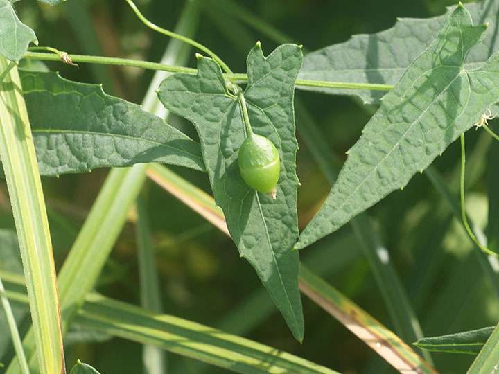 日当たりのよい水辺,河畔,溜池畔などにに生育するつる性の1年草。茎は細く5稜あり,横に這い,巻きひげで他物に巻きつく。茎の稜上には上向きの伏せ毛が密生する。葉は互生し,3角状披針形,または広心形,狭長心形,鋭尖頭,長さ5 - 10 cm,幅2.5 - 7 cm。葉腋から巻きひげを伸ばす。葉腋から総状円すい花序を出し,小さな黄緑色の花をつける。雌雄同株。花序の上部に多数の雄花がつき,基部に個の雌花がつく。萼と花冠は5裂し,裂片は同形で,花弁が10個あるように見える。花被片は長く尖り,長さ5 - 6 mm。雄花の中心部には5個の雄ずいがある。雌花は雄花序の基部に1個つき,長さ約1 cmの細い柄がある。果実は卵形で下半分には突起が散生し,上半分には突起がなく熟すと離れる。 花期:8 - 11月 別名:モミジバゴキヅル,ツタバゴキヅル 分布:本州・四国・九州;朝鮮半島,台湾,中国,インドシナ |