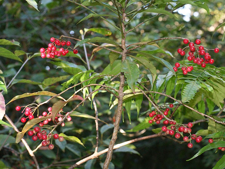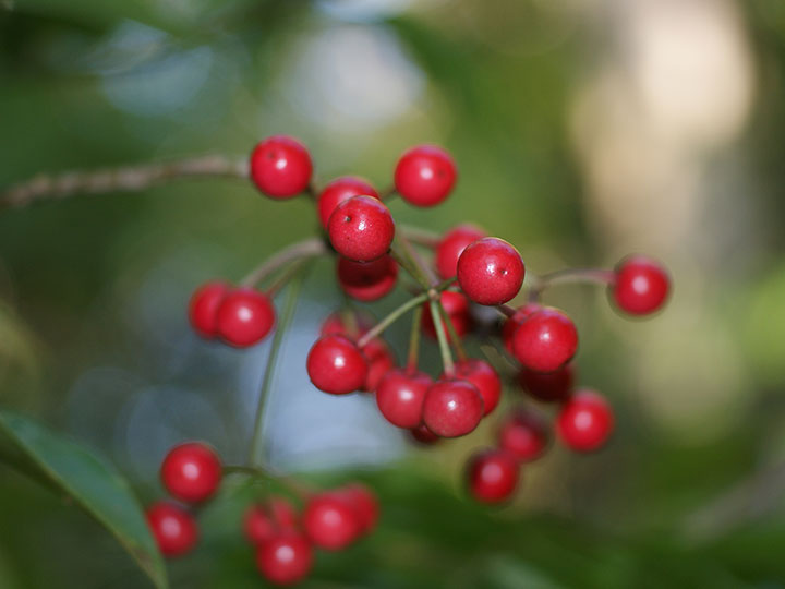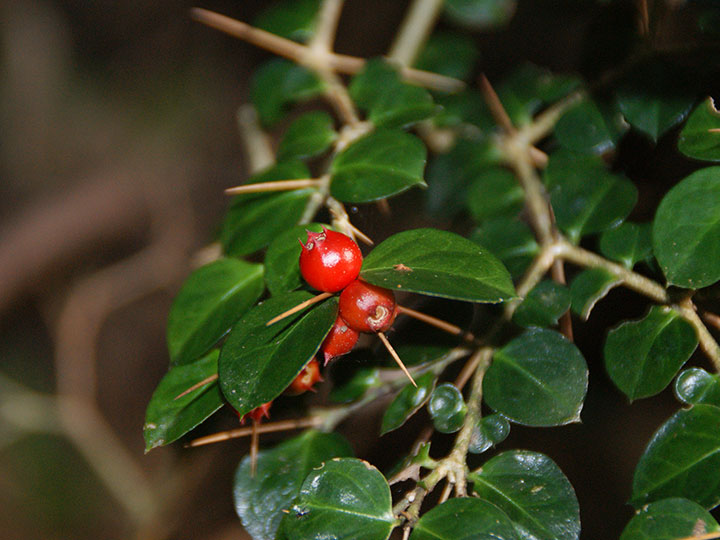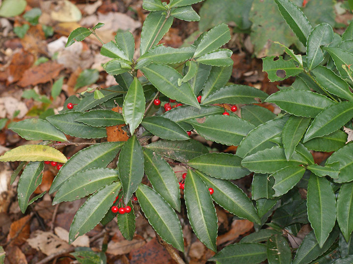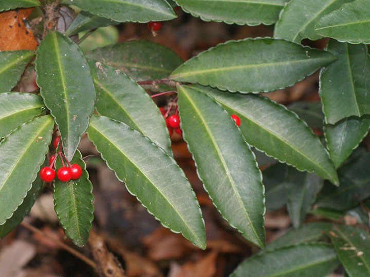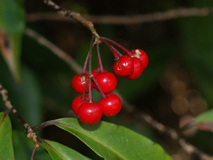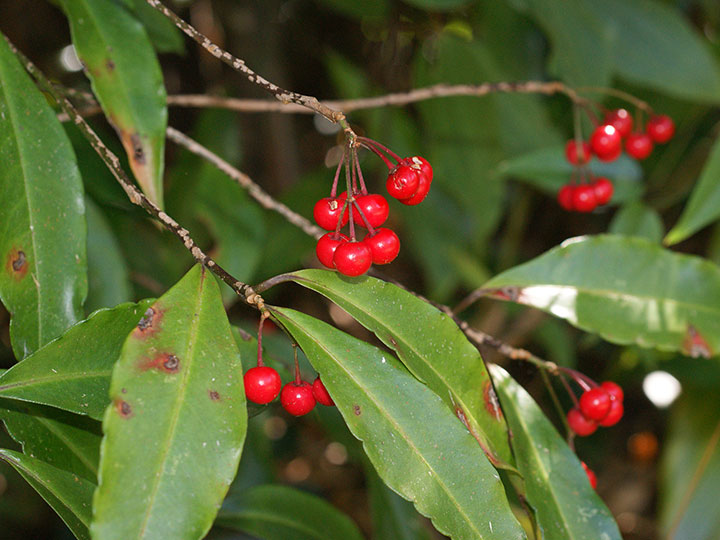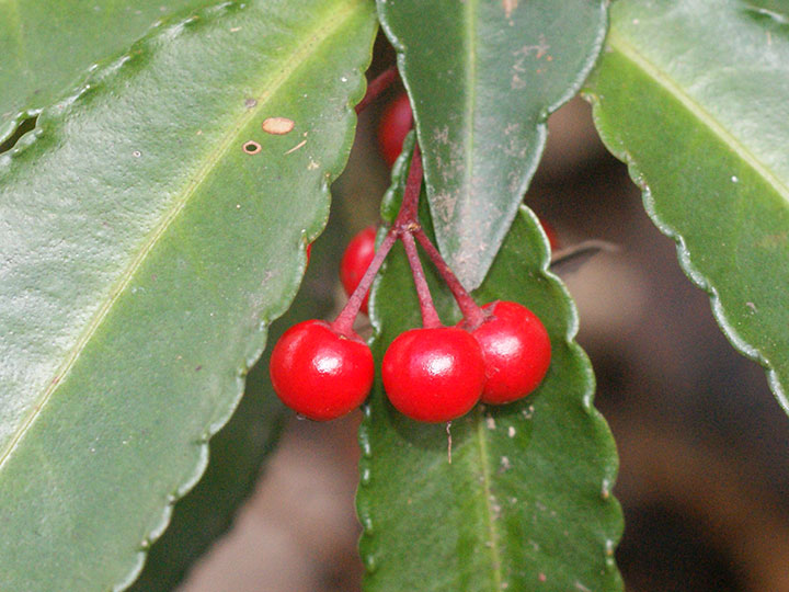 山地の常緑樹林内に生育する常緑低木。高さ30 - 60 cm。茎は直立し,上部にまばらに小枝を出す。樹皮は灰褐色。葉は互生し,葉身は長さ 4 - 13 cm,幅 2 - 4 cmの長楕円形,ふちには波状の鋸歯がある。質は厚く,両面とも無毛,裏面には明点と黒褐色の細点がまばらにある。枝先に散形または散房状の花序を出し,十数個の花をつける。小花柄は長さ1 - 1.5 cm。萼は5深裂し,裂片は卵形で円頭 - 鈍頭。花冠は白色で直径約 8 mm,5深裂し,裂片は反り返る。雄ずいは5個,雌ずいは1個。果実は核果,直径 6 - 8 mmの球形,11月頃鮮紅色に熟し,翌年の4月頃まで残る。 花期:7 - 8月 分布:本州(関東地方)・四国・九州,沖縄;中国,台湾,東南アジア,インド Ardisia ヤブコウジ属: カラタチバナ マンリョウ ヤブコウジ |
