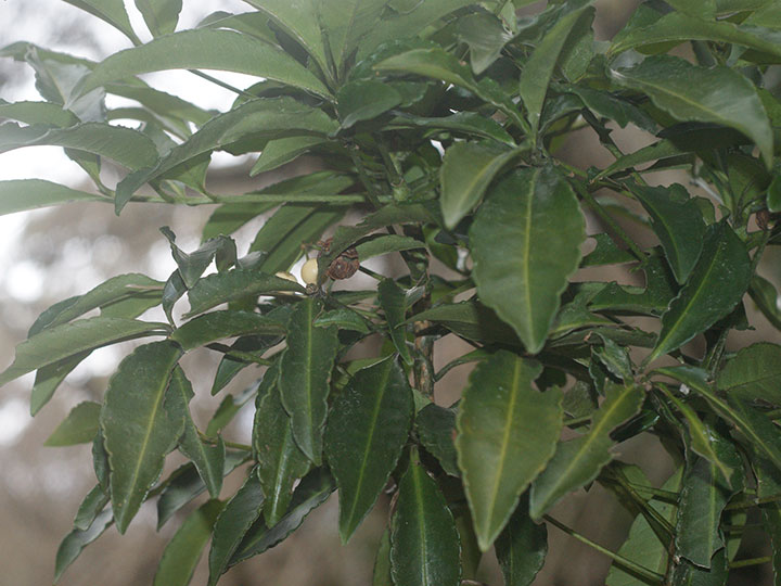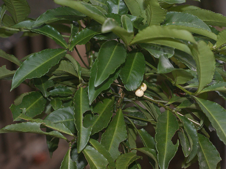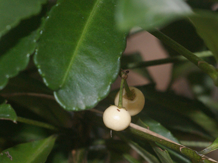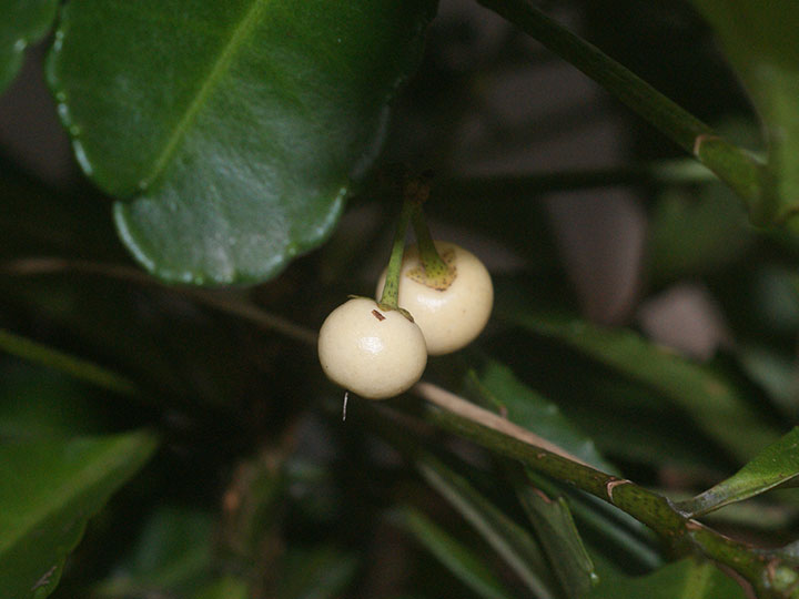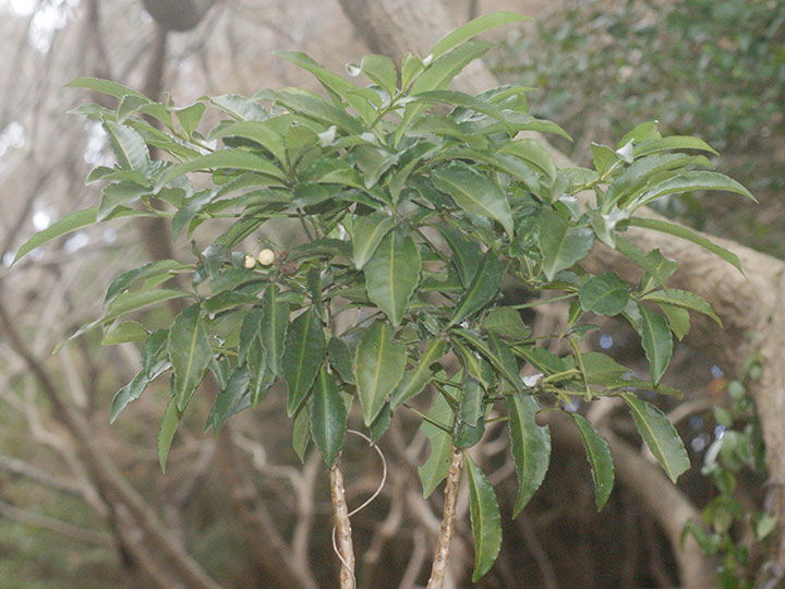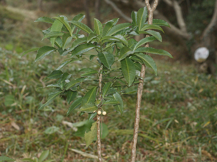 山地の常緑樹林内に生育する常緑低木。高さ30 - 60 cm。茎は直立し,上部にまばらに小枝を出す。樹皮は灰褐色。葉は互生し,葉身は長さ 4 - 13 cm,幅 2 - 4 cmの長楕円形,ふちには波状の鋸歯がある。質は厚く,両面とも無毛,裏面には明点と黒褐色の細点がまばらにある。枝先に散形または散房状の花序を出し,十数個の花をつける。小花柄は長さ1 - 1.5 cm。萼は5深裂し,裂片は卵形で円頭 - 鈍頭。花冠は白色で直径約 8 mm,5深裂し,裂片は反り返る。雄ずいは5個,雌ずいは1個。果実は核果,直径 6 - 8 mmの球形,11月頃白色に熟し,翌年の4月頃まで残る。母種のマンリョウの果実は鮮紅色に熟す。 花期:7 - 8月 分布:本州(関東地方以西)・四国・九州,沖縄;中国,台湾,東南アジア,インド Ardisia ヤブコウジ属: カラタチバナ シロミノマンリョウ マンリョウ ヤブコウジ |