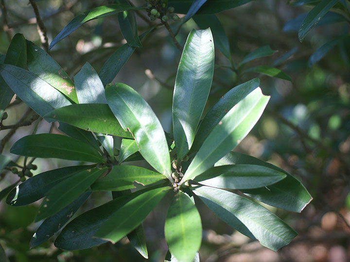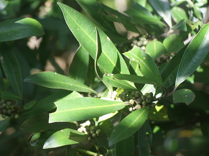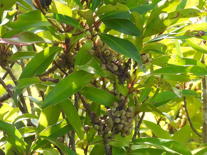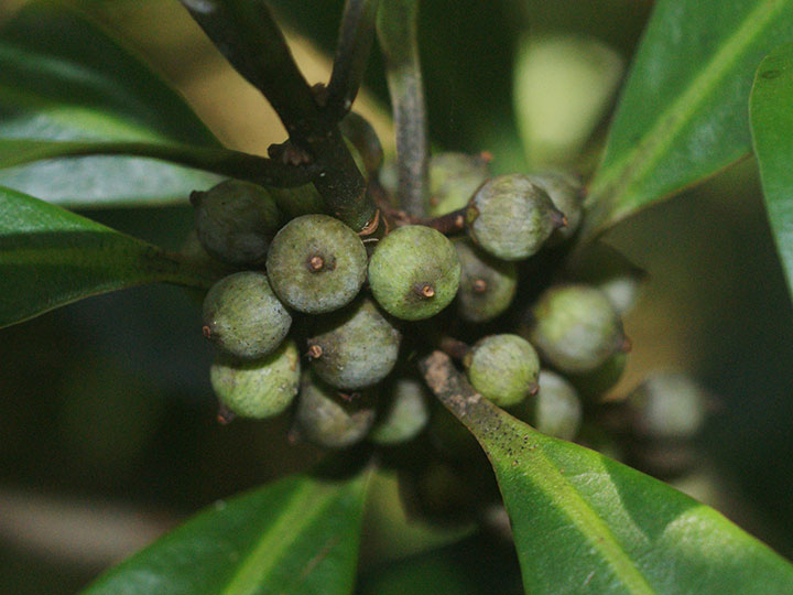 海岸近くの常緑樹林内に生育する常緑低木。高さ5 - 7 m幹は直径 5 - 10 cm,樹皮は紫色を帯びた灰褐色 - 灰青色,無毛,いぼ状の皮目がある。葉は互生,葉身は長さ 5 - 12 cm,幅 1 - 3 cmの倒披針形または線状長楕円形。先は鈍頭,基部は鋭形,縁は全縁,革質,表面は深緑色で光沢があり,裏面は中肋が隆起し,両面無毛。葉柄は長さ 2 - 13 mm。雌雄異株。前年の葉腋に花を3 - 10個束生する。萼片は5個。小花柄は長さ2 - 4 mm。花冠は直径3 - 4mmで,5裂するし,裂片は卵形で平開し,上部はそり返る。花冠の外面や内面の上部は赤味を帯び,暗紫色の斑点がある。雄しべは5個,花冠の中部につき,葯は卵形で大きく,花糸はごく短い。雄花の雌しべは退化している。雌花の花柱は太くて短い円柱形,柱頭は舌状,先端が反曲する。果実は直径5 - 6 mmの球形の核果,10 - 11月に黒紫色に熟し,春まで見られる。 花期:3 - 4月 別名:ヒチノキ,ソゲキ 分布:本州(千葉県以西) - 沖縄;台湾,中国,東南アジア Myrsine ツルマンリョウ属: タイミンタチバナ ツルマンリョウ |