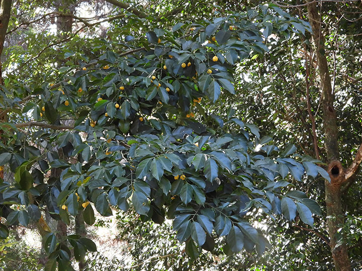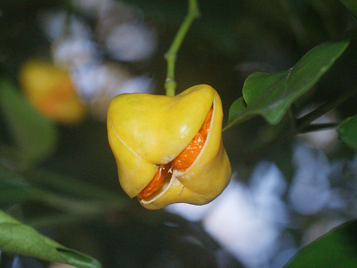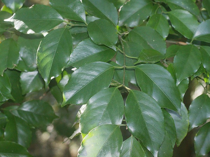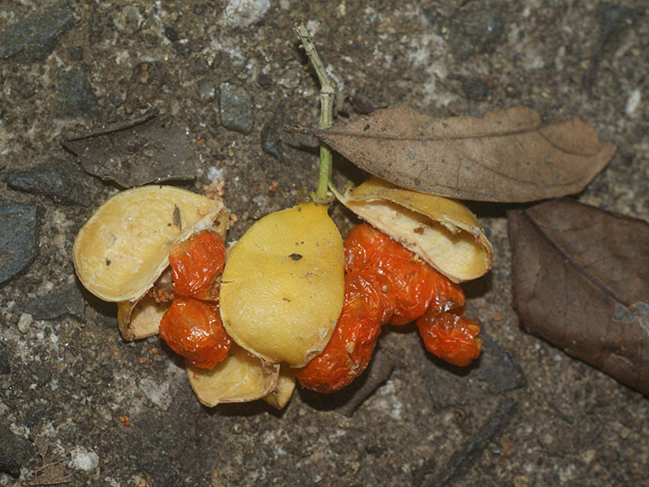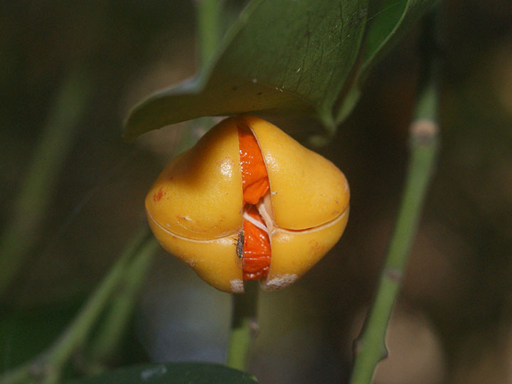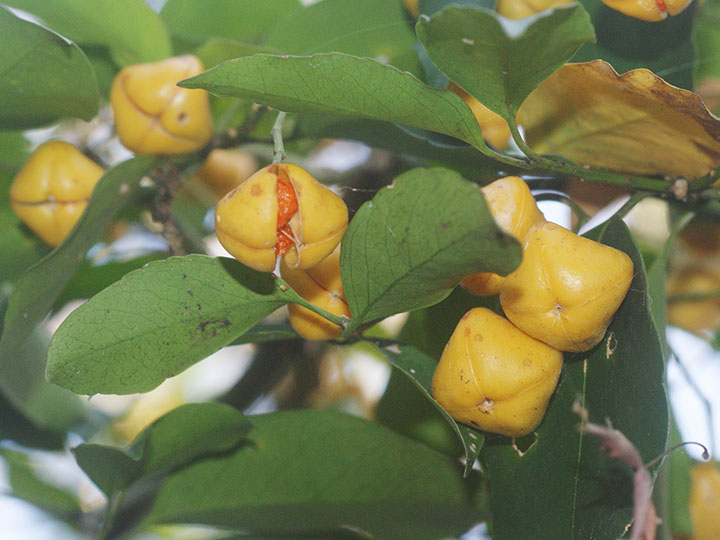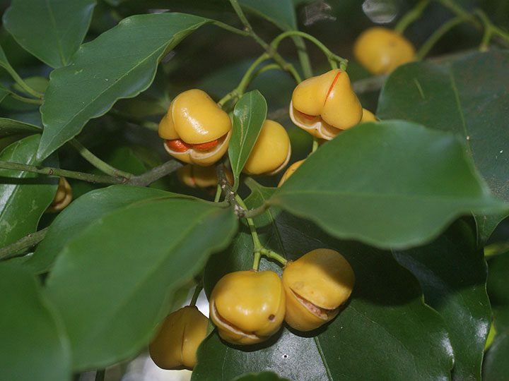 海岸近くの樹林内に生育する常緑小高木。若枝は緑色で4稜がある。葉は対生し,長さ 6 - 8 cmの卵形または楕円形,鋭尖頭,基部は円形またはくさび形,葉縁は基部近くを除いて浅い鋸歯がり,うすい革質,表面は光沢があり,両面とも無毛。葉柄は長さ約 1 cm。本年枝の葉腋から集散花序をだし,小さな花を1- 数個つける。花柄は長さ 5 - 7 mm。花は黄緑色で直径約 8 mm。萼片は4個で半円形。花弁,雄しべともに4個。さく果は長さ 1.5 - 2 cm,幅 1 - 1.5 cmの倒卵球形で,4個の稜がある。淡黄褐色に熟し,4裂して,橙色の仮種皮に包まれた種子を出す。 花期:4 - 6月 果期:11 - 12月 分布:本州(山口県)・四国(徳島県)・九州,沖縄;朝鮮半島南部の島 Euonymus ニシキギ属: コマユミ ツリバナ ヒゼンマユミ ヒロハノツリバナ マサキ マユミ ムラサキマユミ |
