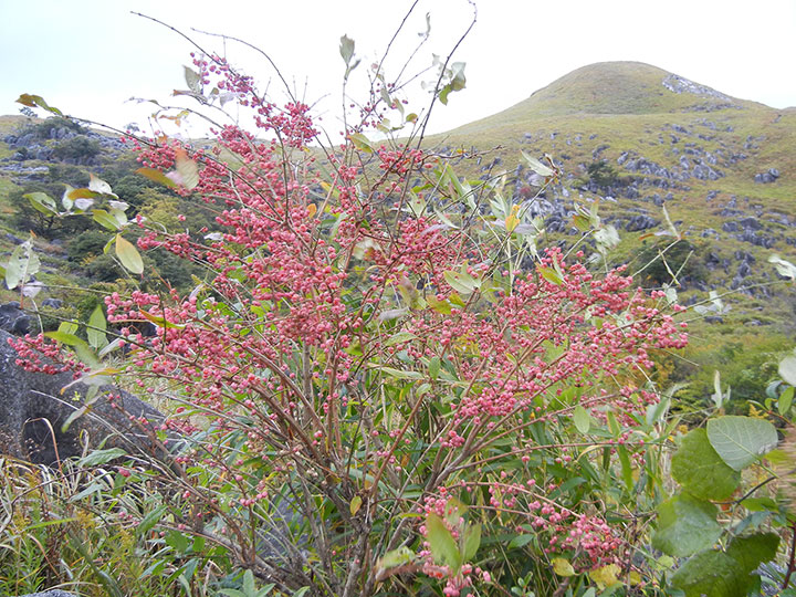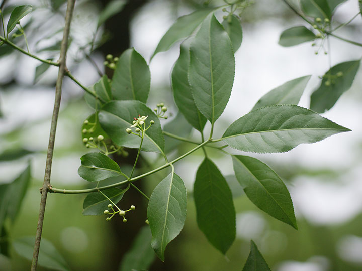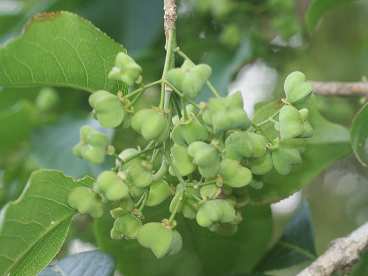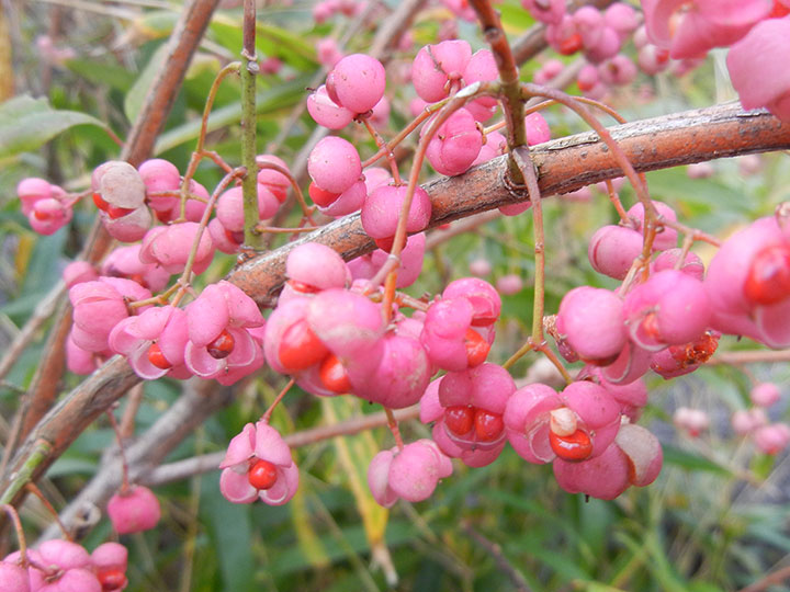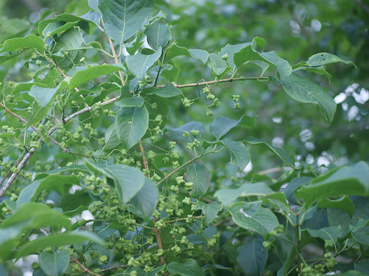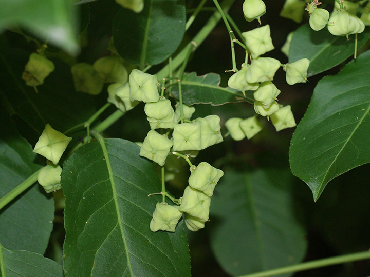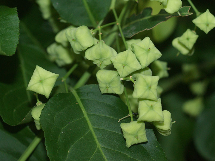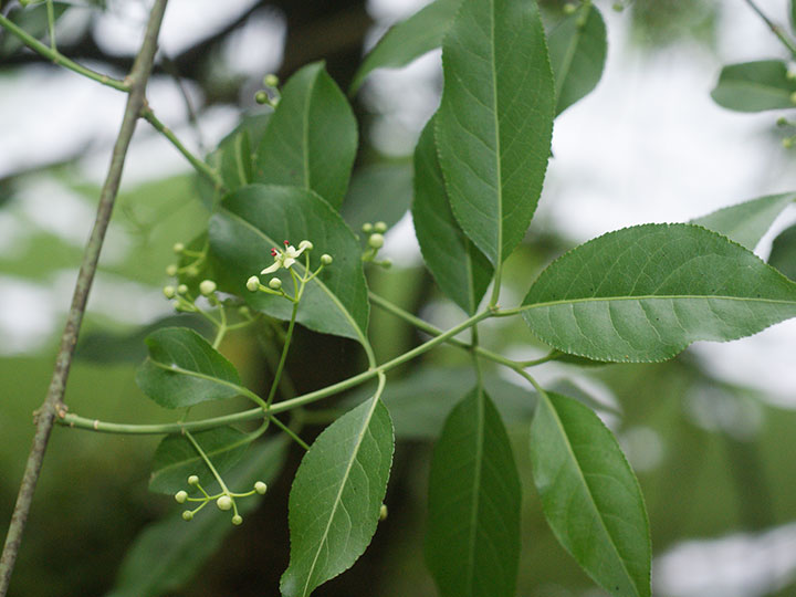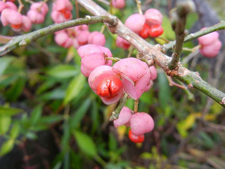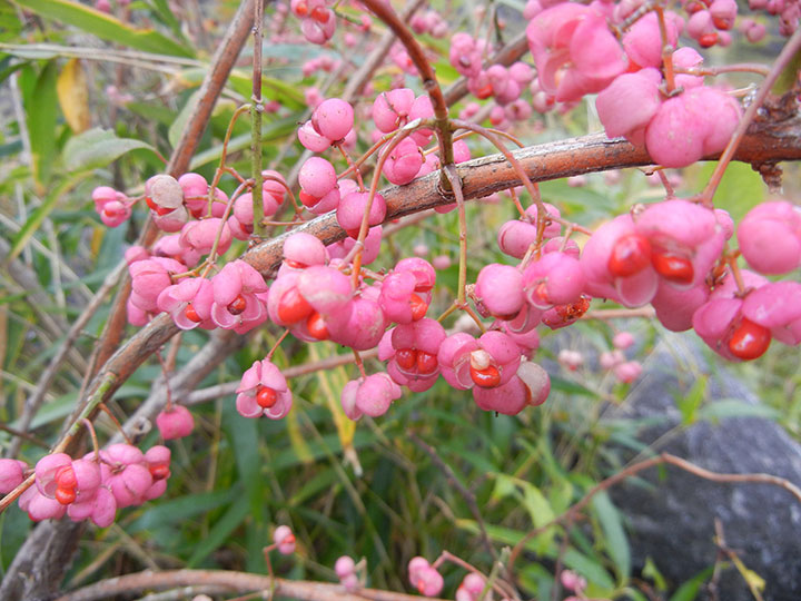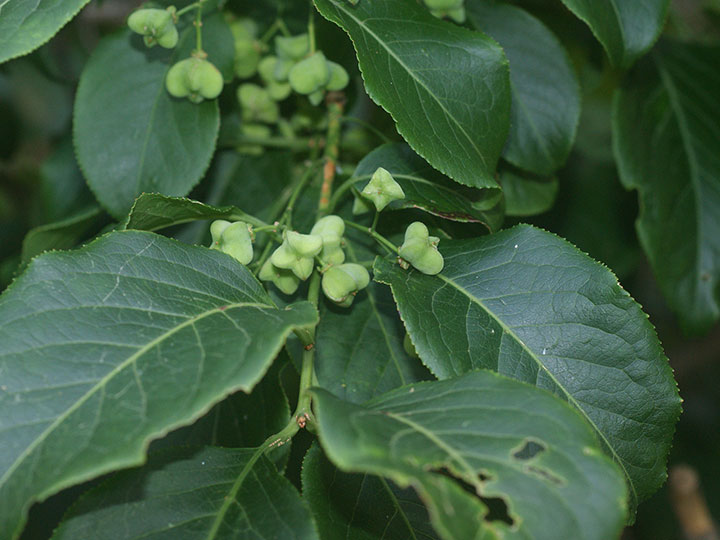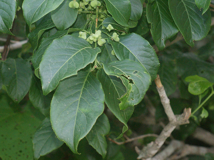 丘陵から山地の林縁に生育する落葉小高木。高さ 3 - 5 m,大きいものは高さ 15 mに達する。樹皮は灰褐色で,老木になると縦に少し裂ける。枝には鈍い4稜があり,若枝は緑色で白い筋のあるものが多く,冬には日の当たる側が紅紫色を帯びる。葉は対生し,長さ 5 - 15 cm,幅 2 - 8 cmの長楕円形,鋭頭 - 急鋭尖頭,基部は円形 - くさび形,縁に細かい鋸歯があり,両面とも無毛。葉柄は長さ 5 - 20 mm。本年枝の葉より下にの芽鱗痕の脇から1 - 5個,長さ2 - 4 cmの集散花序を開出し,1 - 7個の花をつける。萼裂片は4個。花は緑白色 - 淡黄緑色,直径約1 cm。花弁は4個,長楕円形で縁に波状の低い鋸歯がある。雄ずいは4個,四角形の花盤の上につく。葯は黒紫色 - 暗紫色。さく果は直径 1 cmほどの倒三角形で4個の稜があり,淡紅色に熟す。熟すと4裂し,橙赤色の仮種皮に包まれた種子が見えるようになる。 英語名:Hamilton's spindletree, Hamilton's spindle, Himalayan spindle 花期:5 - 6月 果期:10 - 11月 分布:北海道・本州・四国・九州;サハリン,朝鮮半島南部 Euonymus ニシキギ属: コマユミ ツリバナ ヒゼンマユミ ヒロハノツリバナ マサキ マユミ ムラサキマユミ |