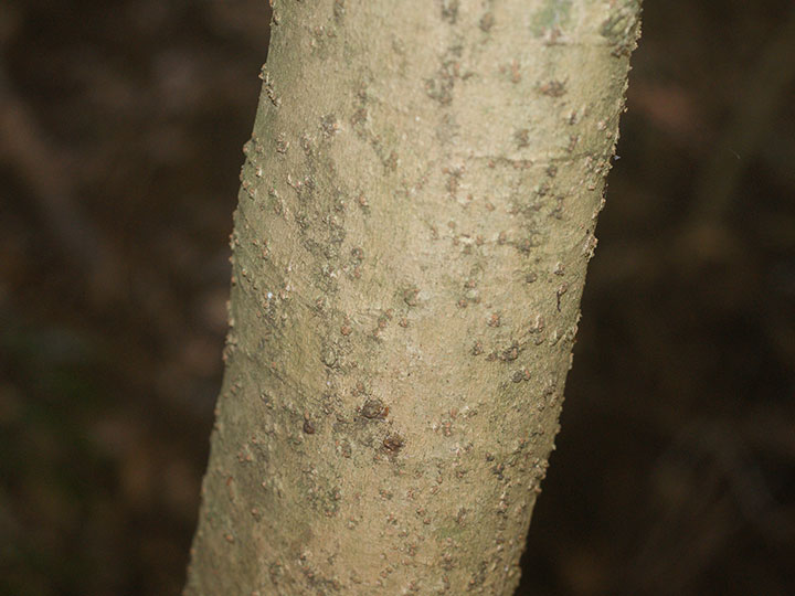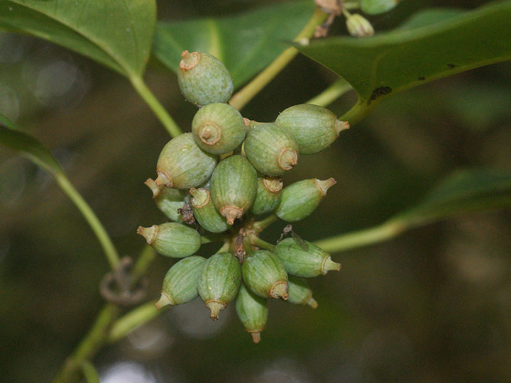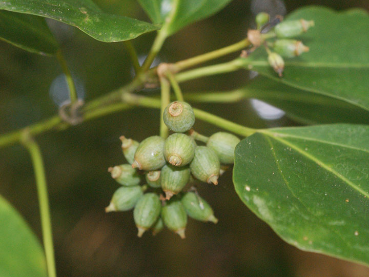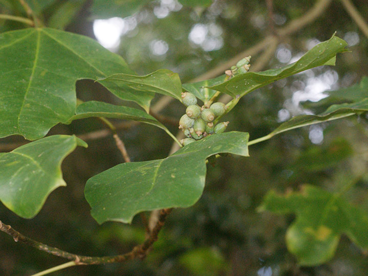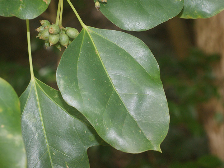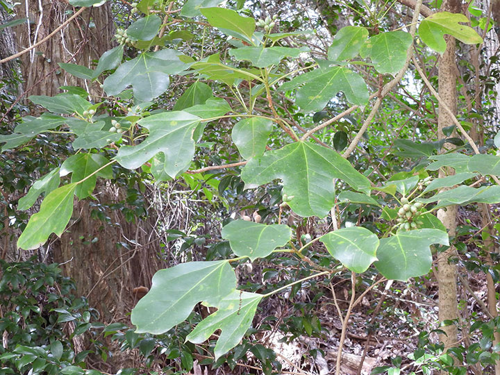 湿り気のある照葉樹林内に生育する常緑小高木。高さ 3 - 8m。樹皮は灰白色。なめらかで,丸い小さな皮目がある。本年枝は緑色。葉は互生し,枝先に集まってつく。葉身は長さ7 - 12 cm,幅3 - 8 cm,卵形または倒卵形で全縁,または2 - 3裂する。若い葉は5裂するものが多い。先は短くとがり,基部は広いくさび形,ふちは全縁ですこし波打ち,顕著な3脈があり,革質,表面は光沢があり,両面無毛。葉柄は長さ2 - 10 cm。花は枝先に長さ4 - 7 cmの花茎を伸ばし,散形花序を1 - 3個出し,淡黄緑色の花を15 - 40個つける。枝先に球形の散形花序を1 - 数個だし,淡黄緑色の小さな花を15 - 40個つける。両性花だけつく花序と,雄花と両性花が混じる花序がある。花序柄は長さ3 - 6 cm。花柄は花時と果時に長さ0.6 - 1.5 cm。萼は5個,鐘形で先は不規則に裂ける。花弁は5個,卵形で長さ約2 mm。雄ずいは5個。子房は心皮が5個,花柱は4 - 5裂する。果実は液果,長さ約1 cmの広楕円形で,黒紫色に熟し,先端に花柱が残る。種子は2 - 5個,ゆがんだ長楕円形で長さ6 - 7 mm,背面に稜が3個ある。 花期:7 - 8月 果期:10 - 11月 分布:本州(千葉県南部以西,伊豆諸島)・四国・九州,沖縄;台湾 |