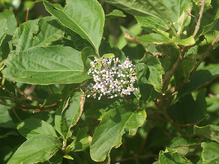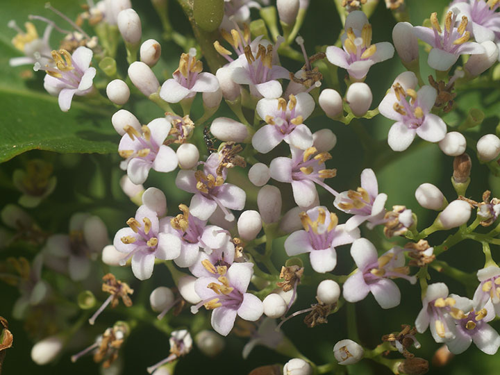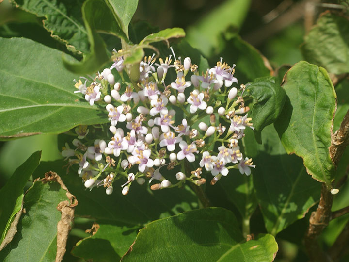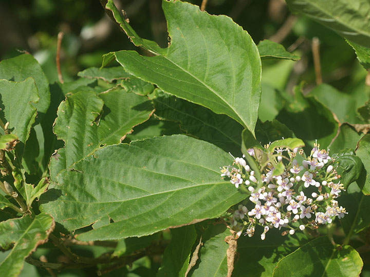 海岸近くの林縁生育する落葉低木。ムラサキシキブの変種。高さ 2 - 3 m。葉は対生し,長さ10 - 25 cmの楕円形,ふちに細かい鋸歯がある。質は厚くて光沢があり,裏面には細かな腺点が多い。葉腋に大形の集散花序をだして,花を多数つける。花冠は淡紫色で径約 4mm,先は4裂し,裂片は平開する。雄ずいは4個,花冠より飛び出る。果実は直径約 4 mmの球形で紫色に熟す。 花期:6 - 7月 分布:本州(東海地方以西),四国(南部),九州(南部),沖縄;朝鮮半島,中国,台湾 Callicarpa ムラサキシキブ属: オオムラサキシキブ ムラサキシキブ ヤブムラサキ |