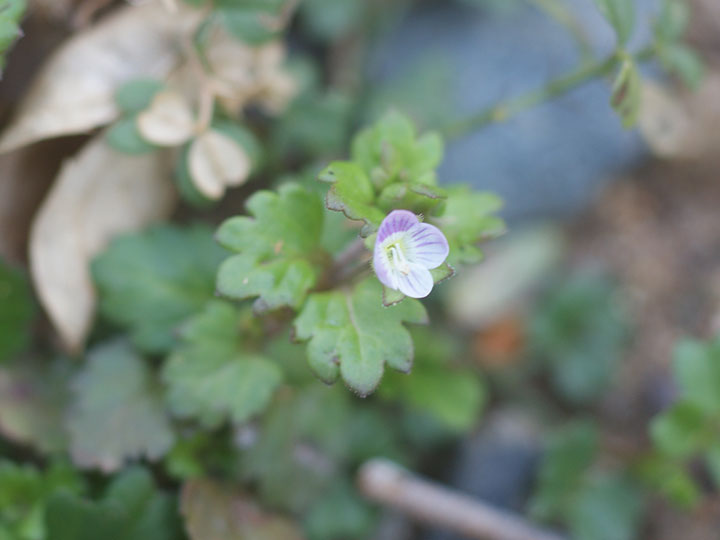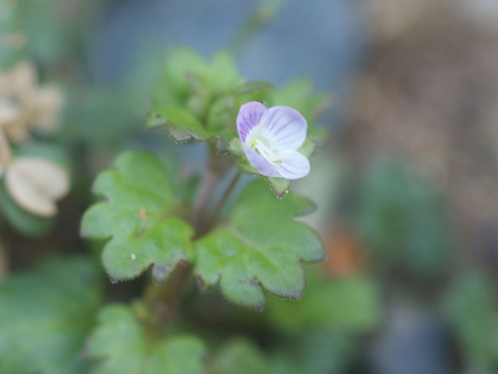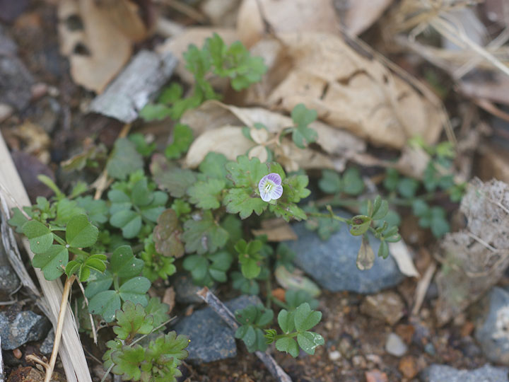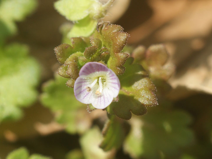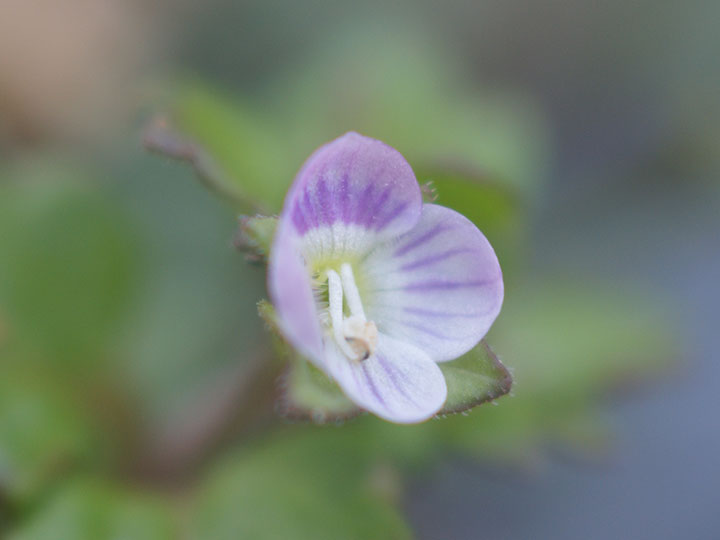 畑や道ばた,石垣の間などに生育する2年草。茎は下部で分枝して横に広がり,先が斜上し,長さ10 - 25 cm,軟毛が密生する。葉は茎下部では対生,上部では互生し,長さ幅とも 0.6 - 1 cm の卵円形で,4 - 8個の先の鋸歯があり,白毛が散生する。茎の上部の葉腋に花を1個をつける。花柄は 3 - 7 mmで曲がった毛がはえる。花冠は4裂し,淡紅白色で紅紫色の条があり,径2 - 4mm。さく果は平たい球形で,中央がくびれ,上部両端は丸く,長さ 2.5 - 3 mm,幅 4 - 5 mm。 花期:3 - 4月 英名:grey field speedwell 分布:本州・四国・九州,沖縄;東アジアの温帯 - 暖帯 Veronica クワガタソウ属: エゾヒメクワガタ コクワガタ サンインクワガタ イヌノフグリ オオイヌノフグリ フラサバソウ エゾルリトラノオ サンイントラノオ トウテイラン ハマトラノオ ホソバヒメトラノオ ヤマトラノオ ムシクサ カワヂシャ |