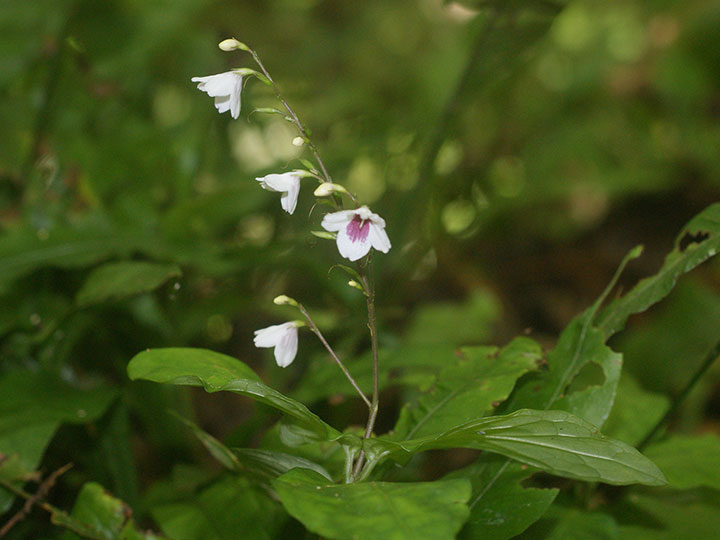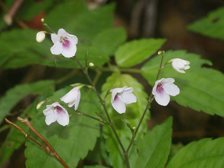 常緑樹林下に生育する多年草。茎は高さ30 - 40 cm。葉は対生し,長楕円形で長さ4 - 10 cm,鋭尖頭,基部はとがり,1 - 1.2 cmの葉柄となる。花は枝先に総状花序にまばらに,横向きに咲く。花冠は白色広鐘形で,内側に紅紫色の部分があり,5裂し,裂片は広卵形で長さ5 - 7 mm。さく果は倒披針形で,長さ12 - 15 mm,2 - 4個の種子がある。 花期:10 - 3 月 分布:種子島,屋久島,沖縄,南西諸島;中国(南部・台湾),東南アジア,インド |