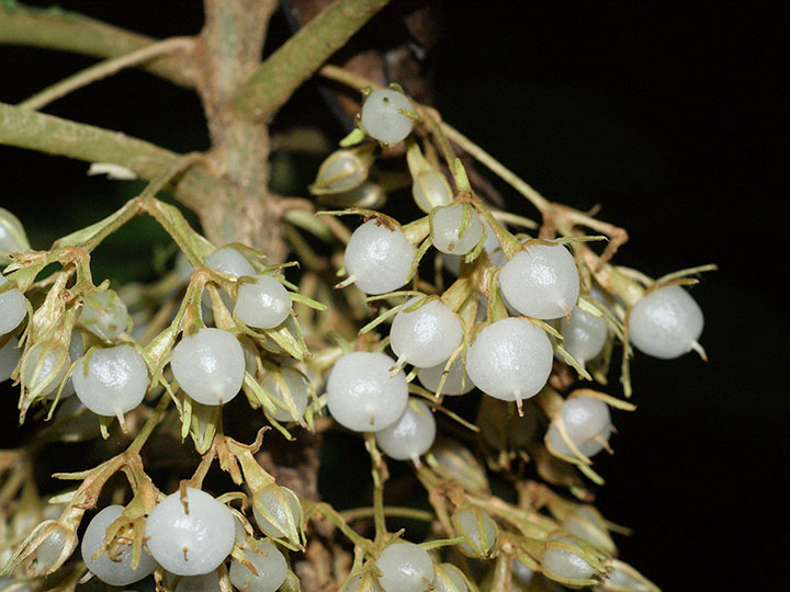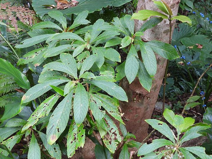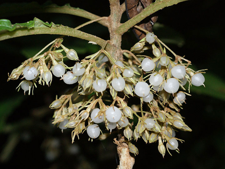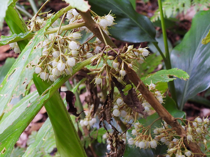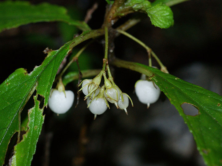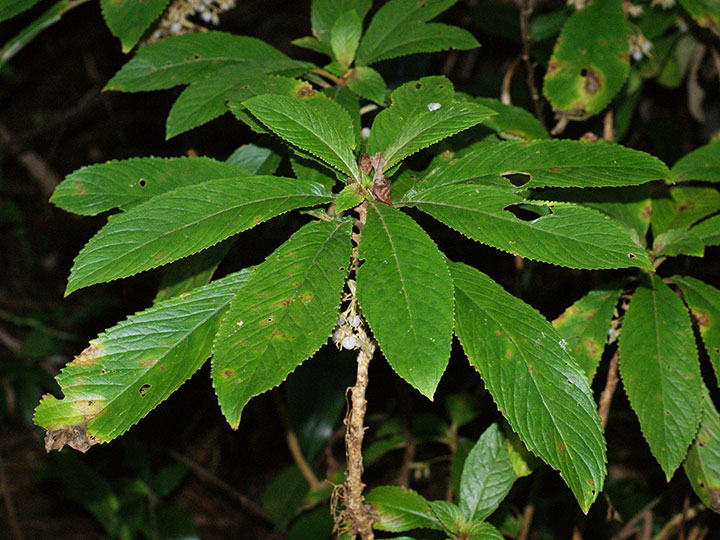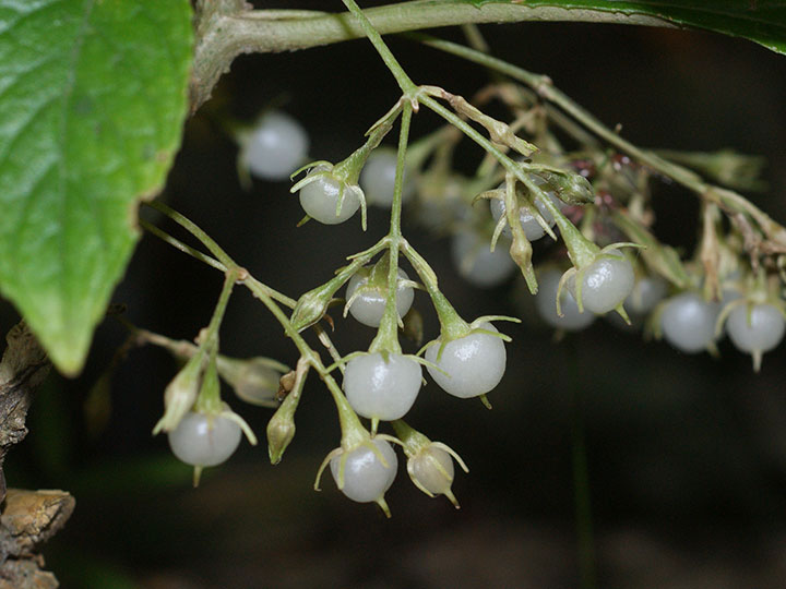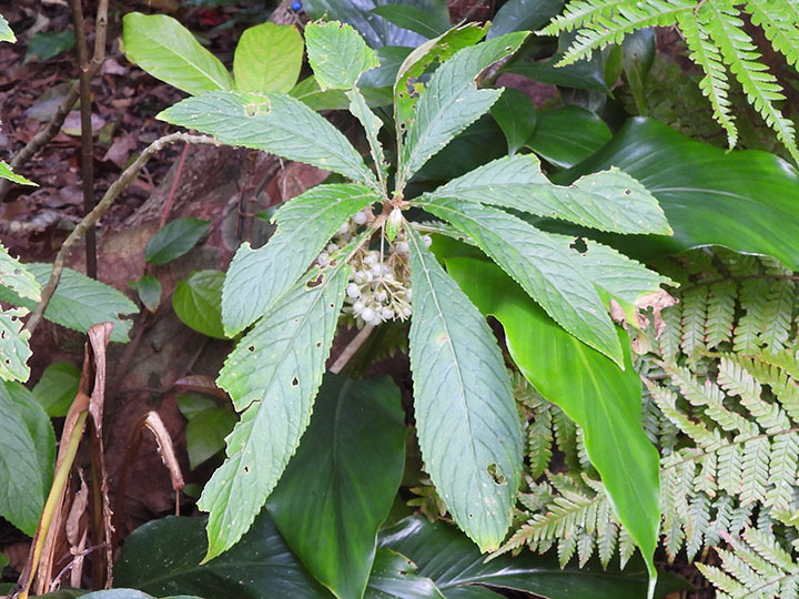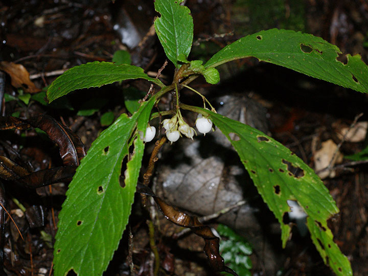 山地の林縁に生育する常緑性の小低木。高さ 30 - 50 cm。茎は直立して,若い時,全体に黄褐色の毛が密生するが,のちにやや無毛になる。葉は互生,葉柄は長さ 2 - 7 cm,葉身は倒披針形または長楕円状広披針形で,長さ10 - 20 cm,幅 2.5 - 6 cm,先はとがり,基部は次第に狭まって葉柄につながり,縁には少し尖った鋸歯が多数ある。葉の裏面には多数の小さな腺点がある。葉腋に長さ 4 - 7 cmの集散花序を出し,まばらに多数の花をつける。苞は披針形 - 線状披針形,長さ 2 - 10 mm。小花柄は細く,長さ 2 - 10 mm。萼裂片は線状披針形,長さ 5 - 6 mm。花冠は白色,車状鐘形,長さ 6 - 7 mm,裂片は楕円形または広卵形で,長さ 4 - 5 mm,幅 2.5 - 3 mm。果実は卵形または球形,熟すと白色になり,径 6 - 7 mm。種子は赤褐色で長さ 0.5 mm。 花期:8 - 10月 分布:琉球;台湾,フィリピン Rhynchotechum ヤマビワソウ属: ヤマビワソウ |