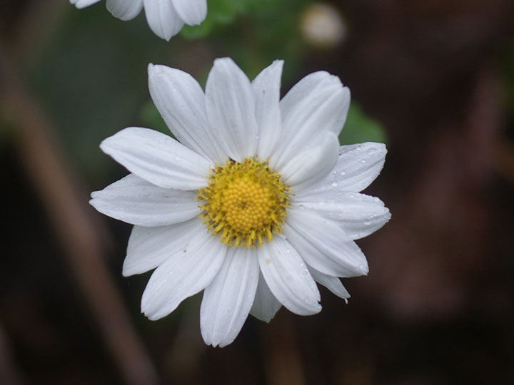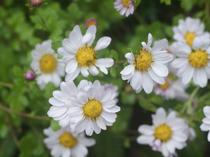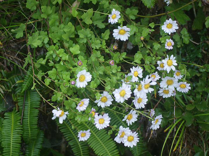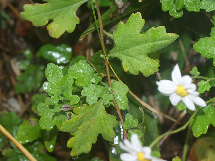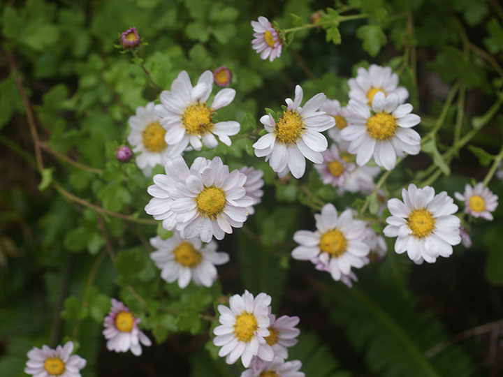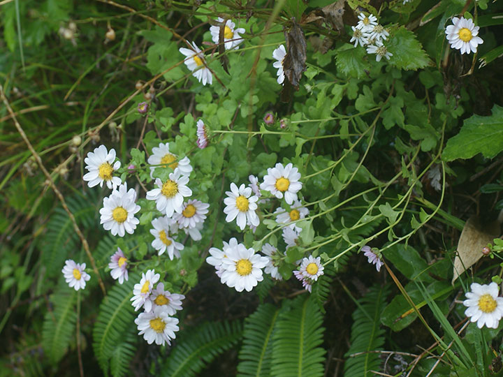 日当たりのよい山地に生育する多年草。茎や葉に竜脳のような香りがある。高さ 40 - 80 cm。茎は細く,毛が密生し,まばらに分枝する。葉は卵形または広卵形で,長さ 4 - 8 cm,ふつう3中裂し,縁は大きな鈍歯,基部はくさび形,短い葉柄に移行する。表面は緑色で短毛があり,裏面は密に丁字状毛があって灰白色。頭花は細長い枝の先に単生し,径 2.5 - 5 cm。総苞は長さ約 7 mmの半球形,総包片はほぼ同長,外片は線形で鈍頭。舌状花は白色,ときに淡紅色を帯びる。柱頭は2分岐し,先端が切形。そう果は長さ約 1.8 mm,冠毛は無い。 花期:10 - 11月 分布:本州(福島県・新潟県以南)・四国・九州(宮崎県) Chrysanthemum キク属: アシズリノジギク イソギク イワインチン サツマノギク シマカンギク チョウセンノギク ニジガハマギク ノジギク ハナイソギク リュウノウギク |