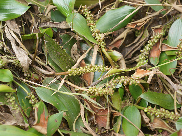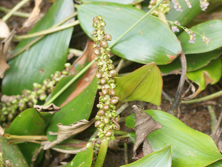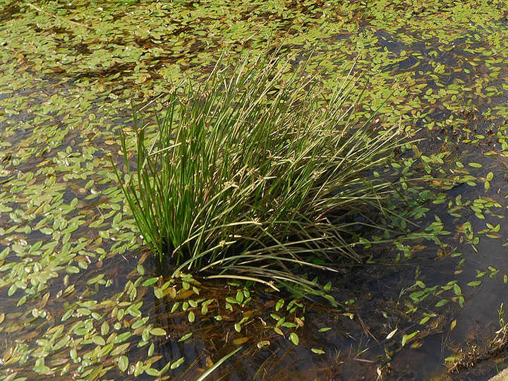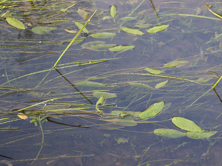淡水の池や沼に生育する浮葉性の多年草。地下茎は泥中をはい,各節から根を出し,1節おきに水中茎を出す。水中茎は下部に沈水葉,上部に浮水葉をつける。沈水葉は,長さ16 cm,幅2.5 cm,披針形,鋭尖頭,質は薄く,葉柄の長さ1 - 17 cm。浮水葉は長さ4 - 11 cm,幅 2 - 4 cm,狭長楕円形 - 楕円形,鋭頭,葉柄の長さ6 - 15 cm。花期には浮水葉の葉腋から長さ2.5 - 8 cmの穂状花序を水面上に直立させる。穂状花序には無柄で黄緑色の小さな両性花を密につく。花は花被はなく,雄ずいは4個,子房は 1 - 3 個。果実は長さ 3 - 4 mmの扁平な広卵形。 花期:6 - 10月 別名:ヒルナ,サジナ 分布:北海道・本州・四国・九州,琉球;朝鮮半島,中国 |