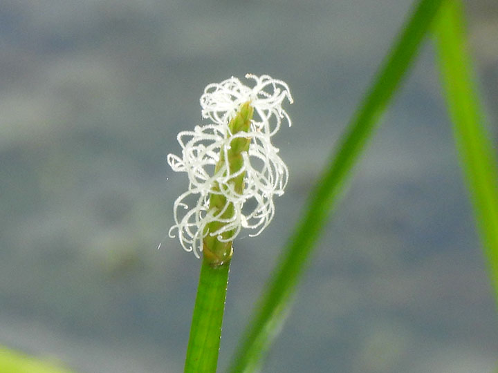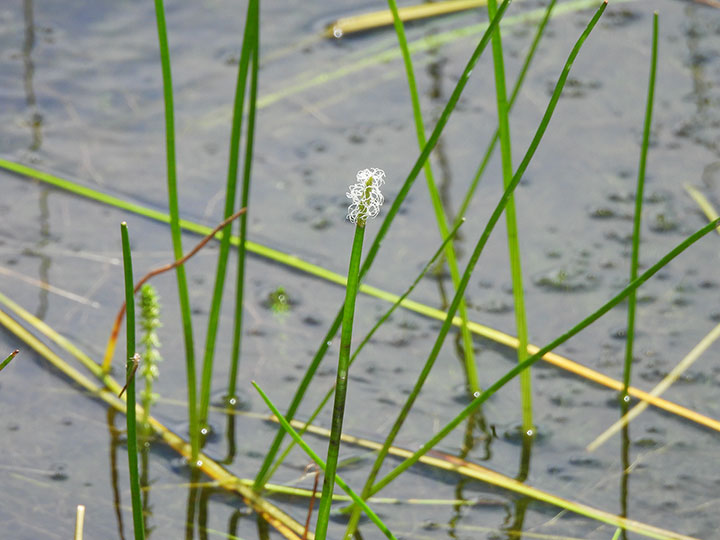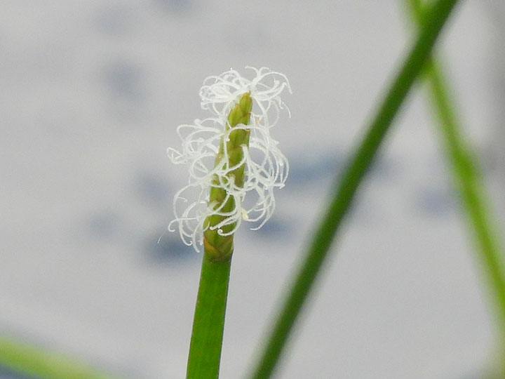 池,沼,水田に生育する多年草。匍匐根茎は長く泥中をはい,先端に径 5 - 8 mmの小塊茎をつくる。発芽様式などの違いにより,水田型とため池型2つの生態型がある。茎は高さ 40 - 80 cm,円くて灰緑色を帯び,径3 - 4 mm,内部は中空,多数の横の隔膜があり,断面は円形。基部は長さ5 - 20cmの赤褐色の葉鞘に包まれる。花は両性花,雌性先熟。小穂は茎の先に茎とほぼ同じ太さの円柱形となり,長さ 2 - 4 cm,径 3 - 4 mm。苞はない。鱗片は狭長楕円形でらせん状に並び,黄緑色で長さ6 - 8 mm。やや厚く,光沢はない。柱頭は2個。雌ずいは白色。果実は倒卵状で長さ約2 mm,柱基は円錐形,刺針は果実より長く,上端に下向きの小剛毛がある。 花期:7 - 10月 分布:本州(関東 - 北陸地方以西)・四国・九州;朝鮮半島 |