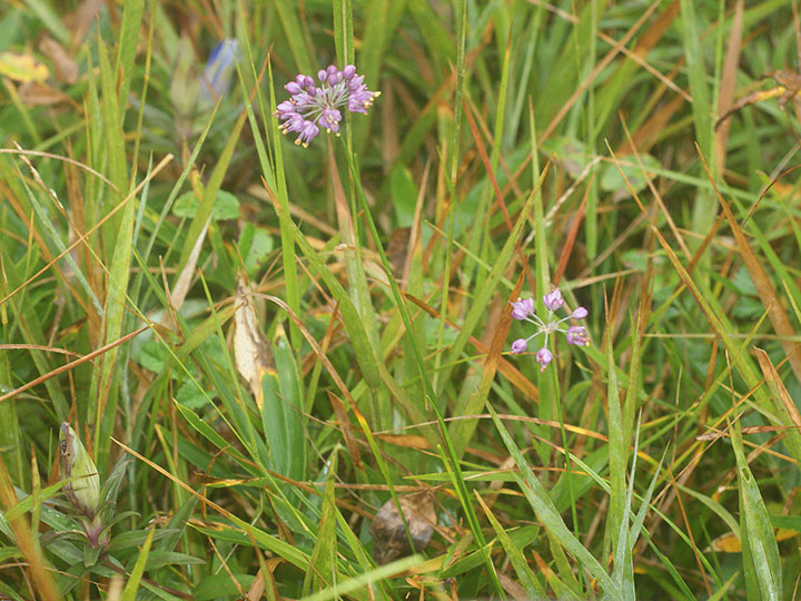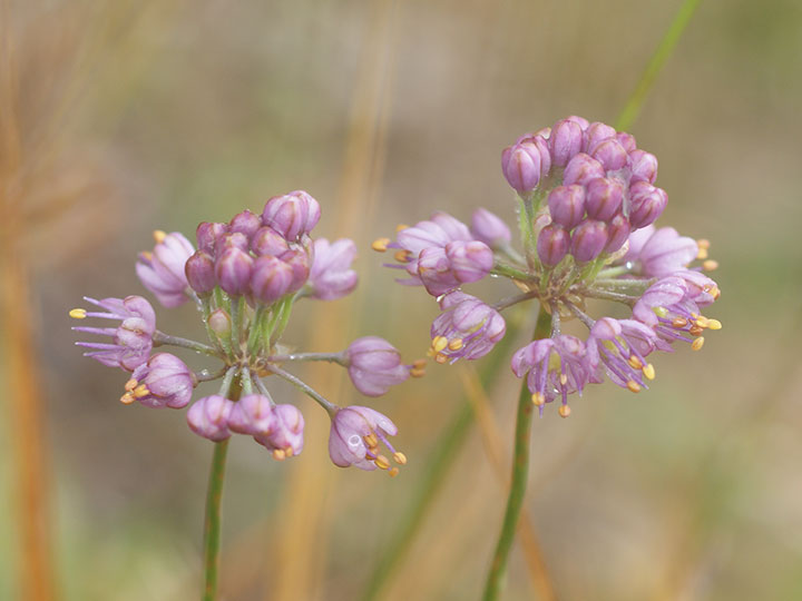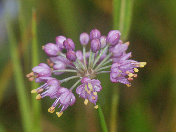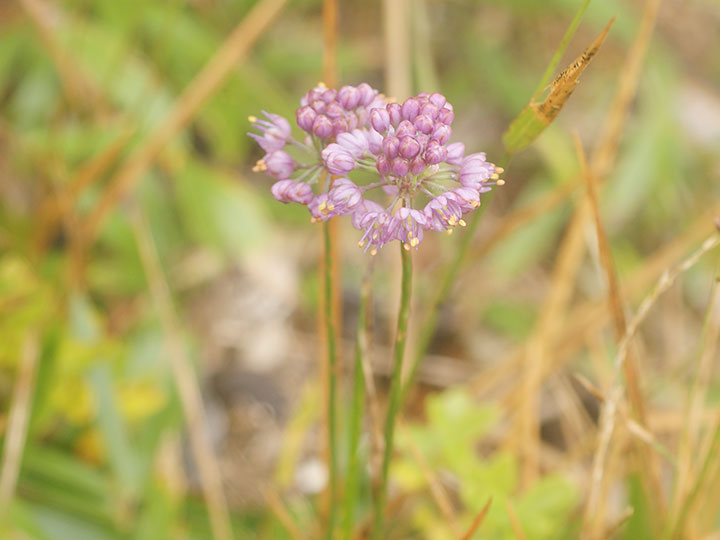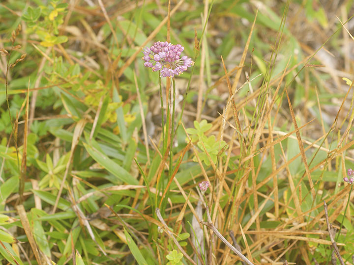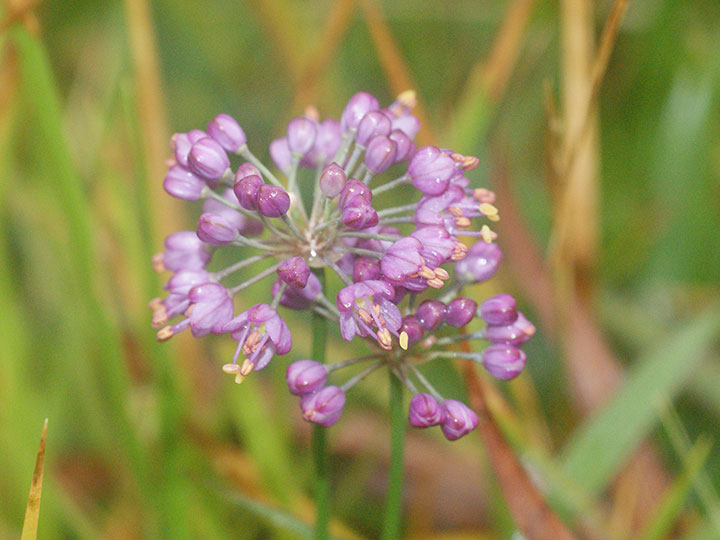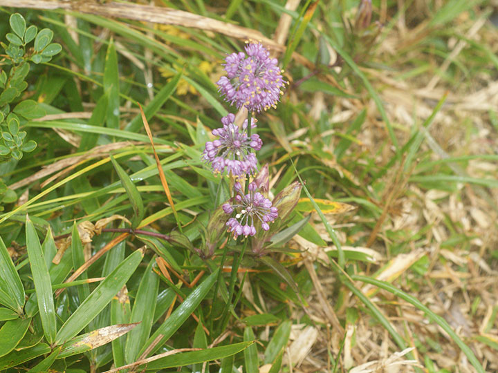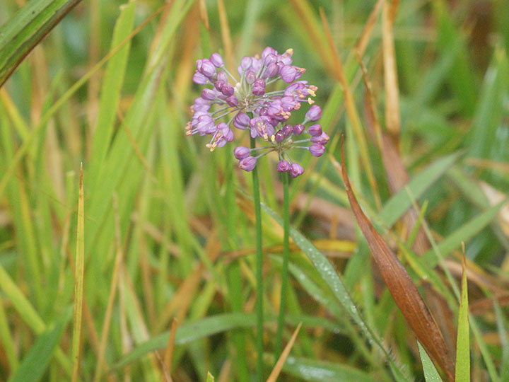 山地の草原に生育する多年草。鱗茎は狭卵形。高さ 20 - 40cm。葉は線形で中実,長さ15 - 30 cm,幅1.5 - 3.5 mm,断面は三角形ないし広線形花は花茎の先に多数が球状の散形花序につく。花被片は6個,紅紫色,楕円形で先は円く,長さは約 4 mm,平開しない。花糸は花被片より長く,花糸基部に歯牙がある。雌ずいの基部の蜜腺に帽子状の覆い構造が発達しない。 花期:10 - 11月 分布:九州南部(霧島山地・薩摩半島) Allium ネギ属: (アマミヤマラッキョウ) イトラッキョウ キイイトラッキョウ コシキイトラッキョウ シロウマアサツキ タマムラサキ ナンゴクヤマラッキョウ ノビル ヤマラッキョウ |