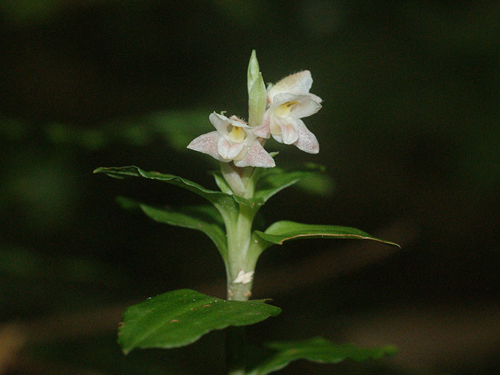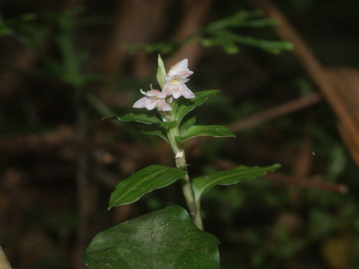 山地樹林下に生育する多年草。茎は匍匐し,上部は直立し,高さ10 - 15 cm。葉は互生して5 - 8個つき,長さ2 - 3 cm卵状長楕円形で,先はとがり,縁は波打つ。苞は花と同長。花は総状花序で頂生し,淡紅白色の花を数個つけ,短毛が多く,やや平開する。 花期:10 - 12月 分布:沖縄本島 Goodyera シュスラン属: アケボノシュスラン オオシマシュスラン オオミヤマウズラ カゴメラン キンギンソウ クニガミシュスラン シマシュスラン シュスラン ツユクサシュシュラン ツリシュスラン ハチジョウシュスラン ヒメミヤマウズラ ベニシュスラン ミヤマウズラ ヤクシマシュスラン |