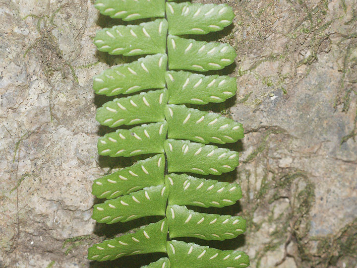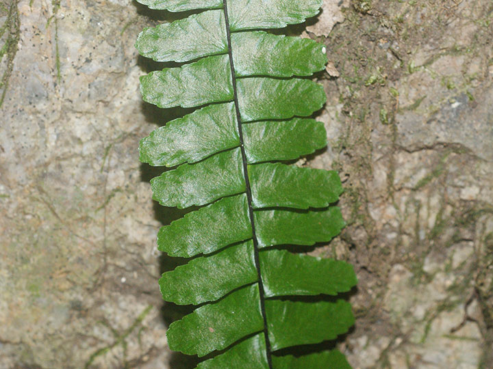低山 - 山地の乾いた岩上や岩壁などに生育する常緑性シダ。根茎は短く斜上し,ひげ根を束生し,葉を叢生する。葉柄は長さ約10 cm,暗紫褐色 - 黒色の光沢がある針金状で,基部には小型の鱗片がつくが,上部は平滑。葉身は単羽状で披針形 - 線状披針形,長さ10 - 40 cm,幅2 - 4.5 cm。中軸に無性芽はつかず,先端まで正常に伸びる。羽片は多いものでは40対,開出し,互いに接近してつき,広楕円形,膜状革質,光沢があり,円頭,基部の前側はほとんど耳状にならず,縁には粗い鋸歯がある。胞子嚢群は中肋と辺縁の間ににつき,線形 - 長楕円形で長さ1 - 4 mm,包膜はやや三日月形の長楕円形。 分布:本州(関東地方北部,伊豆半島以西)・四国・九州 Asplenium チャセンシダ属: アオガネシダ イチョウシダ イヌチャセンシダ カミガモシダ クモノスシダ クルマシダ コウザキシダ コタニワタリ コバノヒノキシダ シマタオオニワタリ チャセンシダ トキワトラノオ トラノオシダ ヌリトラノオ シモツケヌリトラノオ ヒノキシダ |
