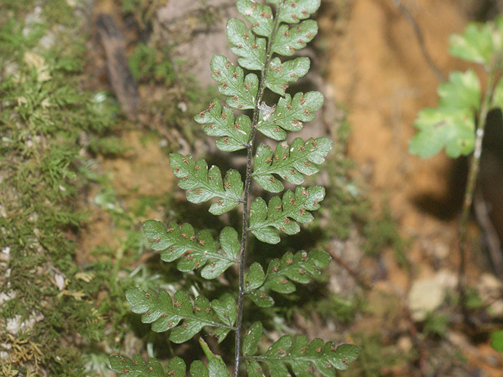 山地の林内の林縁,林下,のやや湿った所に生育する常緑性シダ。高さ 20 - 35 cm。根茎は長く匍匐し,径1.5 - 1.9 mm。葉柄は長さ10 - 20 cm,淡緑色で基部は褐色を帯びる。基部のみ早落性の鱗片がある。基部の鱗片は茶褐色,披針形 - 三角状長楕円形,長さ1 - 1.2 mm。葉軸に半透明の多細胞毛が,向軸側でやや密,背軸側は疎らにある。葉は2回羽状全裂,葉身は披針形,長さ11 - 15 cm,幅 3.6 - 5.3 cm,鈍頭 - 鋭頭,全体に半透明の多細胞毛がある。側羽片は狭三角状卵形で短柄があり,長さ 1.7 - 2.6 cm,幅 0.8 - 1.1 cm。裂片の先は円頭 - 鈍頭,縁は全縁 - 鋸歯縁。質は薄い紙質,淡緑色で全体に半透明の単細胞毛がある。胞子嚢群は裂片の辺縁寄り,主脈の両側に2列に並び,円形で径 0.7 - 0.8 mm,包膜は円腎形で表面には単細胞毛がある。 別名:オキナワハシゴシダ 分布:沖縄(沖縄島,石垣島) Thelypteris ヒメシダ属: アミシダ イヌケホシダ イブキシダ ケホシダ コウモリシダ コハシゴシダ ハリガネワラビ ヒメワラビ ホシダ ミゾシダ リュウキュウハシゴシダ |